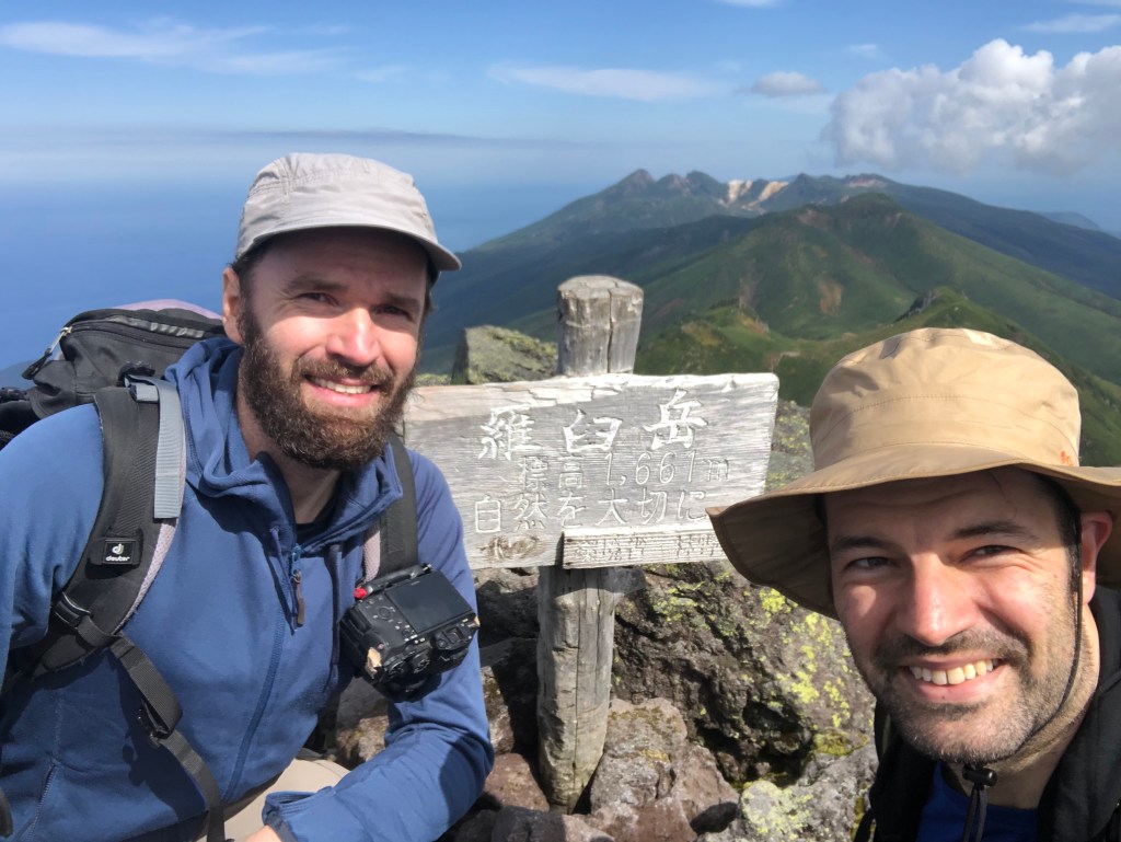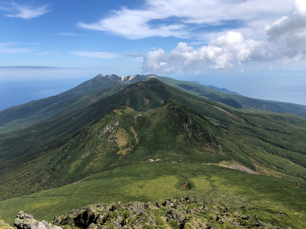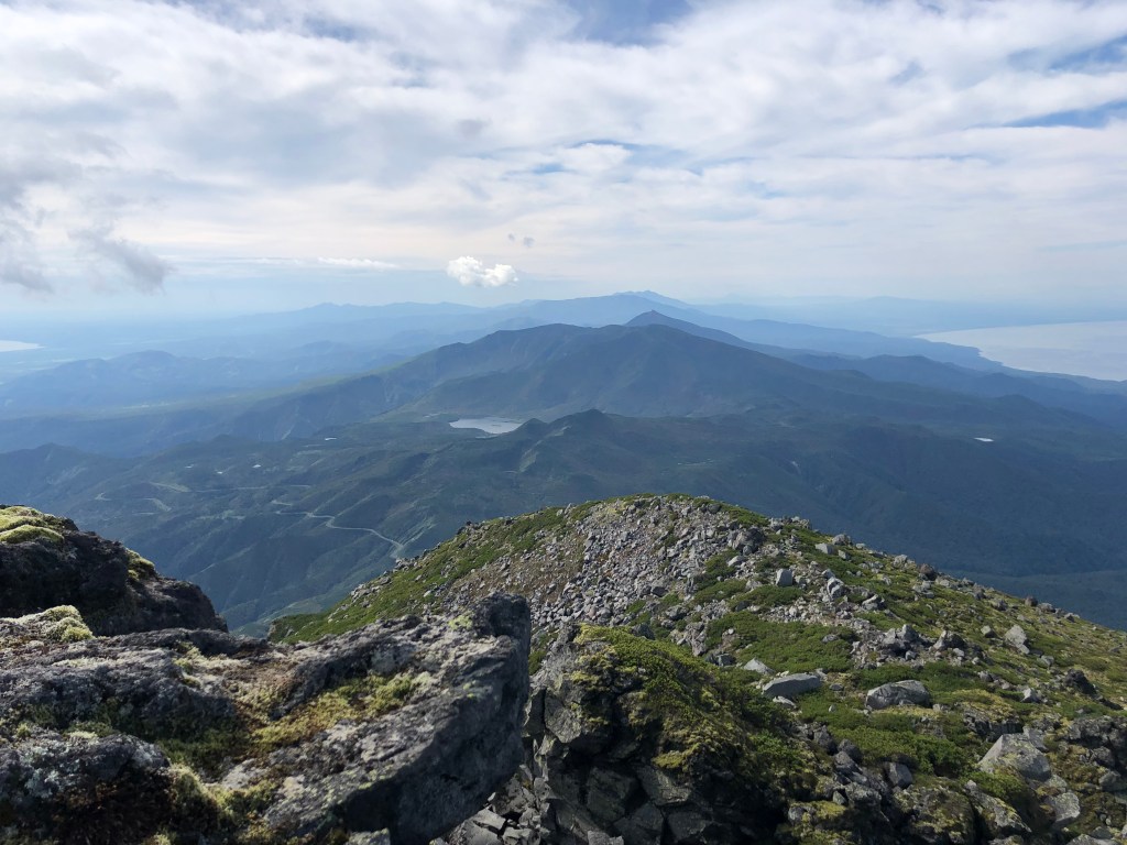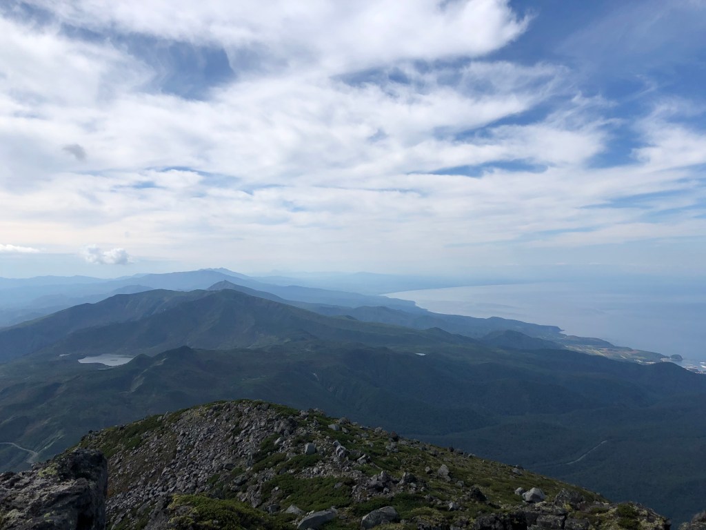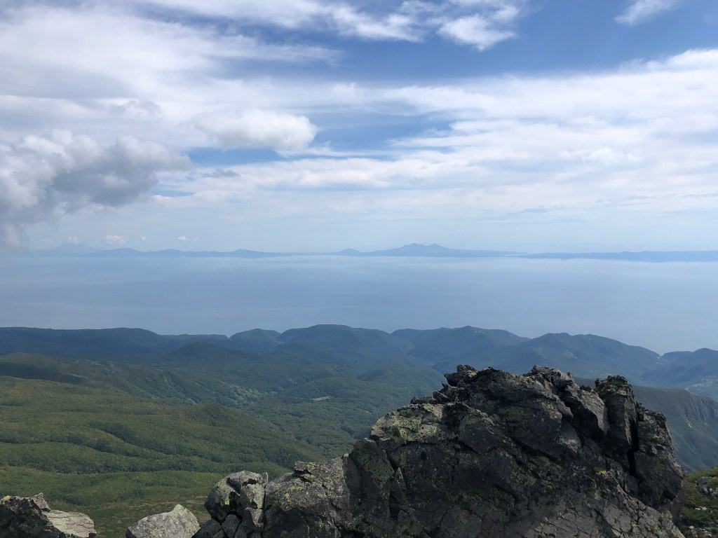 Blick vom steinigen Gipfel des Rausu-dake. Bei gutem Wetter kann man bis nach Kunashiri (unter Russland’s Kontrolle aber terretorial beansprucht von Japan) schauen.