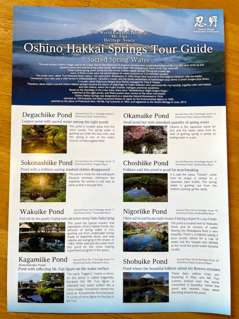 Einer der Teiche, der Deguchi-Ike 出口池 liegt dabei etwas abseits und ein weiterer, der Sokonashi-ike befindet sich im Areal des Hannoki Bayashi Museums, was ca 300 Yen Eintritt kostet, aber definitiv ein Besuch wert it. Persoenlich muss ich sagen dass mich der Kagami-ike 鏡池 am meisten beeindruckt hat. Dies liegt sicherlich daran, dass er zentral liegt, relativ gross ist, enorm klares Wasser hat und dazu noch den Fuji-san im Hintergrund hat an vielen Stellen.