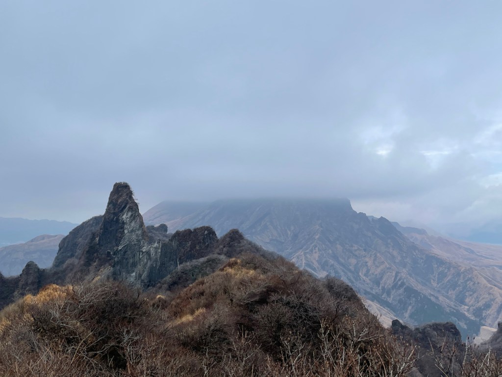 Neko-dake 根子岳 ist ein Peak im Aso Hauptkrater. Der Berg ist sehr markant durch seine zackenhaftige Spitze und man erzaehlt sich im Volksmund, dass der Berg den Namen bekam, da die spitzen Peaks von weitem den Berg wie eine Katze aussehen lassen. Allerdings ist die japanische Lesung 根子 (Wurzel, Herkunft) und nicht 猫 (Katze), was mich ein wenig an dieser Namenslegende zweifeln laesst.