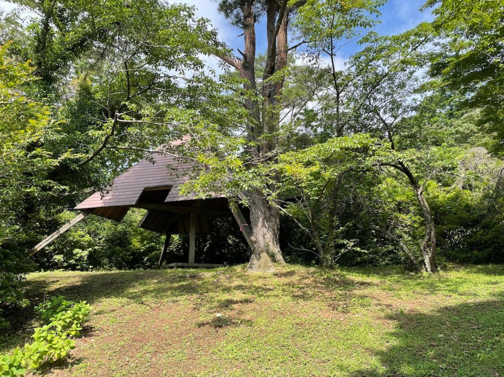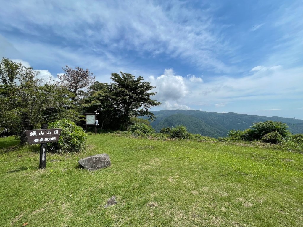 Kurz vor dem eigentlichen Gipfel den Shiro-yama 城山 gibt es links eine kleine Eben mit Aussicht auf die Umgebung, vielen Ajisai Blumen 紫陽花 und einer ueberdachten Raststaette aus Holz in Pyramidenform. Weiter den Wanderweg entlang kommt man schliesslich auf der Bergspitze an, die relativ frei ist. Von dort hat man eine gute Sicht auf das Umland. Ein grosser Stein markiert die Ruinen der Burg des Hauses Doi 土肥​城址 aus der Kamakura-Zeit. Sitzmoeglichkeiten gibt es nicht wirklich aber ein kleiner Pavillon bietet Schutz vor der Sonne.