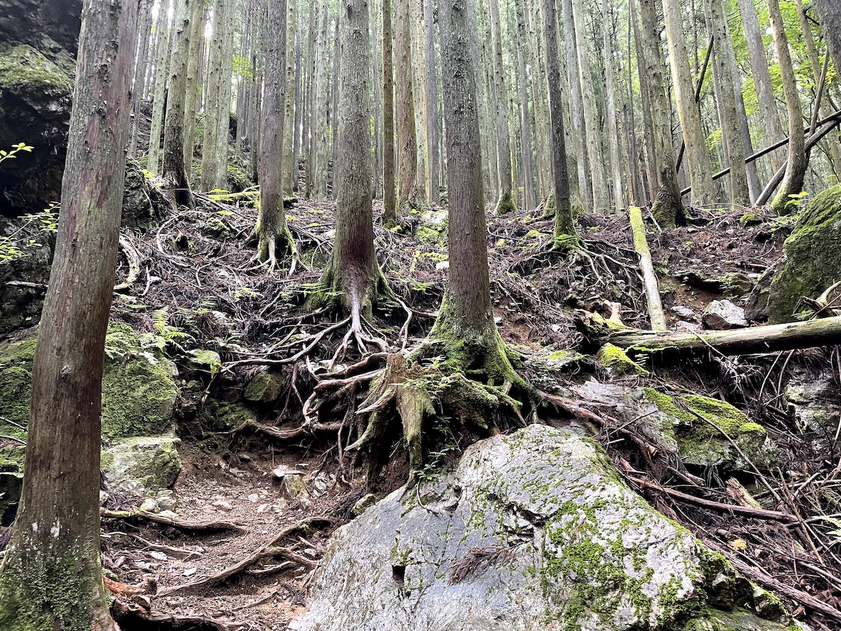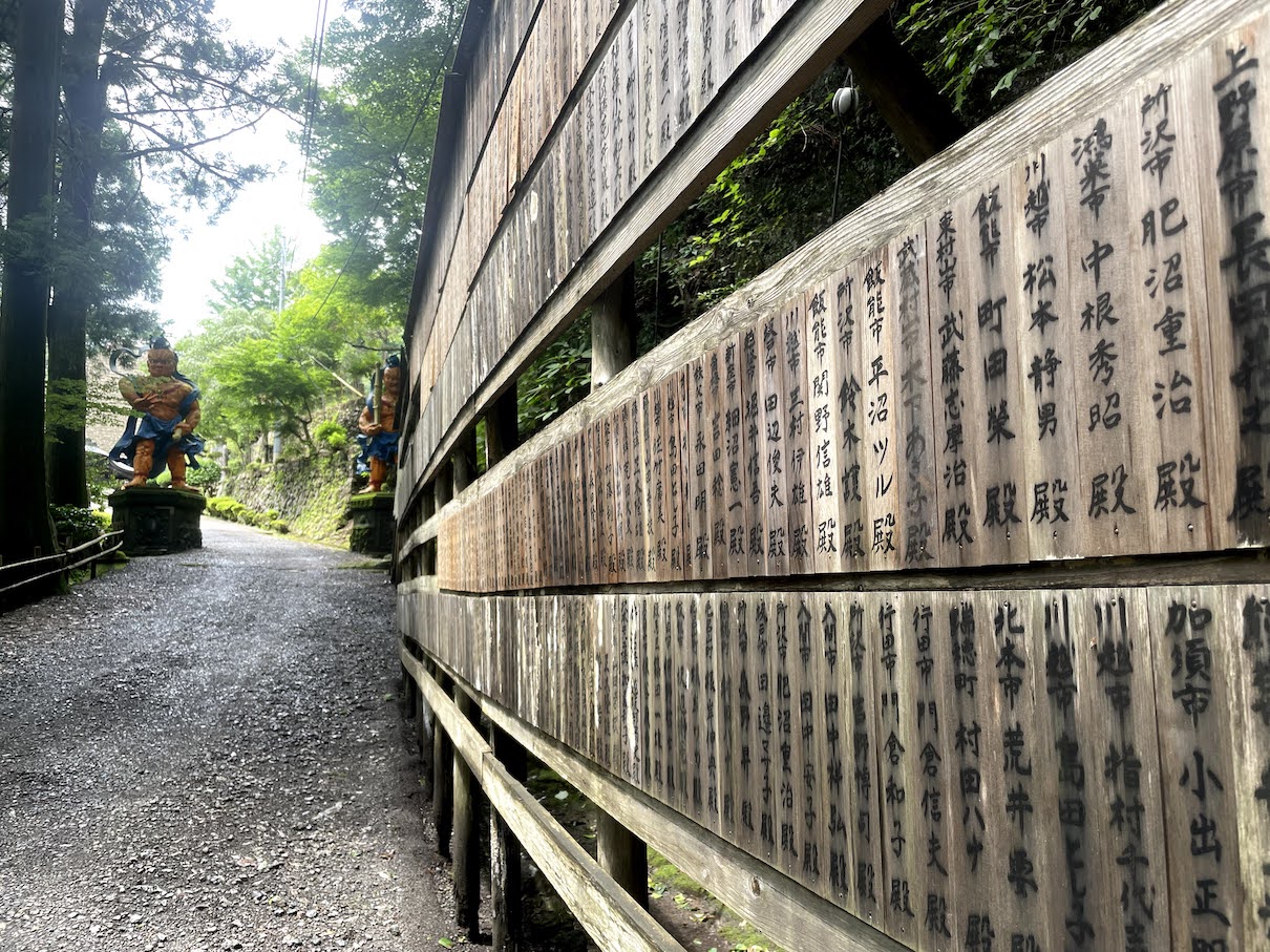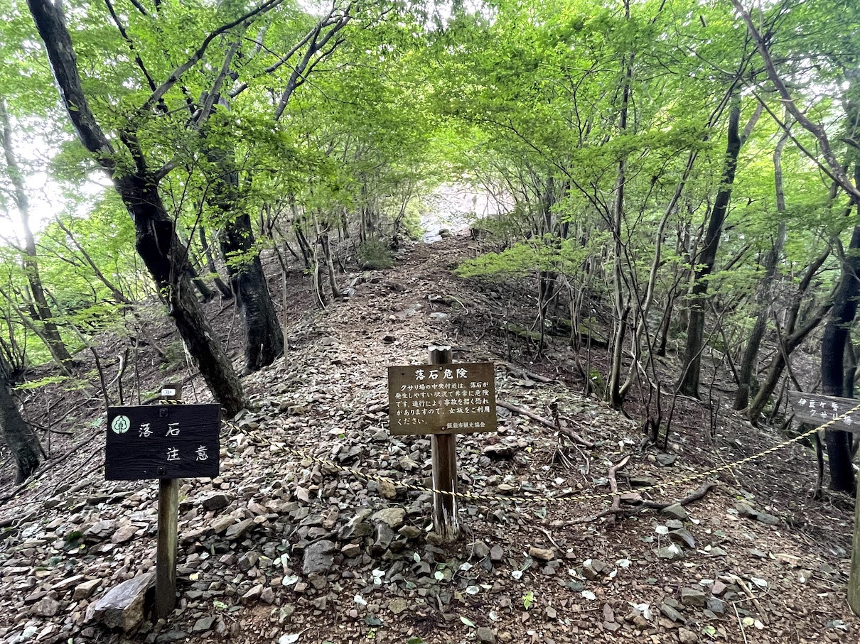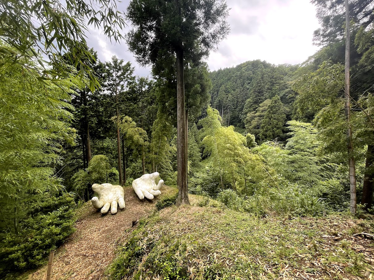 Weiter geht es links an der Ridge entlang. Kurz vor dem Gipfel des Izugatake kommt man an eine Gabelung, die geradeaus auf den Otoko-saka (Maenner-Anstieg) zeigt, rechts ab die Umfuehrung ueber den Onna-saka (Frauen Anstieg). Die Bezeichnungen geben die Schwierigkeit der Route an, wobei der Onna-saka der leichtere ist. (Man trifft sehr oft und auf vielen Bergen in Japan auf diese Bezeichnungen.) Der Otoko-saka fuerht ueber eine sehr steile Felswand mit Klettereinlagen. Der Weg ist aktuell gesperrt wegen erhoehter Gefahr (Stand July 2021) und da es an den Tagen davor sehr stark geregnet hat, nahm ich auch den Onna-saka hinauf zum Izugatake. Der Gipfel des Izugatake ist ein mittelgrosser Fels, aber ansonsten gibt es weder Sicht noch Sitzmoeglichkeiten. Daher bin ich recht schnell weitergezogen. Der Izugatake ist der hoechste Gipfel auf der Route und ab hier geht es noch ueber 2-3 andere Erhoehungen bis man schliesslich in Agano ankommt. Der Weg dorthin zieht sich sehr und dauert mehrere Stunden. Am Ende des Wanderweges gibt es einen Tempel, den Nenogongen Tenryuji 子ノ権現天龍寺 bei dem vor dem Eingang rechts unten eine Hand-Statue plaziert ist, was aussieht wie in einem Freiluft Kunstmuseum. Bei der Tempelanlage gibt es auch ein paar Vending Machines, falls der Trinkvorrat knapp gewurden ist. Vom Tempel aus folgt man zunaechst der gepflasterten Strasse bis der Wanderweg nach Agano wieder rechts abgeht (ist ausgeschildert aber nur auf Kanji). Von dort aus sind es dann noch gute 3-4km und ne gute Stunde bis man am Bahnhof ankommt.