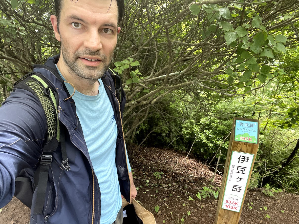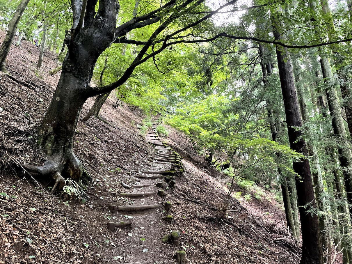 Es gibt 2 empfohlende Hauptkurse. Der erste geht auf den Izugatake und auch wieder runter zum Shomaru Eki 正丸駅. Der zweite ist die Ueberquerung des Izugatake (伊豆ヶ岳を越える道) hin zur Agano Station 吾野駅. Da mir die erste Route zu kurz erschien entschied ich mich fuer die Ueberquerung. An einem sonnigen Tag waehrend der japanischen Regenzeit nutzte ich die Gunst der Stunde und fuehr nach Shomaru Station. Am Bahnhof angekommen geht es direkt rechts rum unter einem Tunnel durch und schon ist man auf dem Weg. Nach ca 20 Minuten geht der Wanderweg links ab. Zunaechst folgt man einem Fluss aufwaerts durch ein Waldstueck. Der Anstieg ist teilweise sehr steil, aber nicht allzu schwierig. Nach einer knappen Stunde kommt man dann auch schon auf dem Gorin-yama 五輪山 an. Gorin, “5 Ringe”, steht in Japan auch fuer Olympia. Treffend, dass ich den Hike fast genau ein Monat vor Beginn der Tokyo Olympics machte (die allerdings wegen Corona leider zur absoluten Farce avancierten). Auf dem Gipfel des Groin Yama befindet sich eine Bank, ansonsten ist es dort aber weniger spektakulaer.