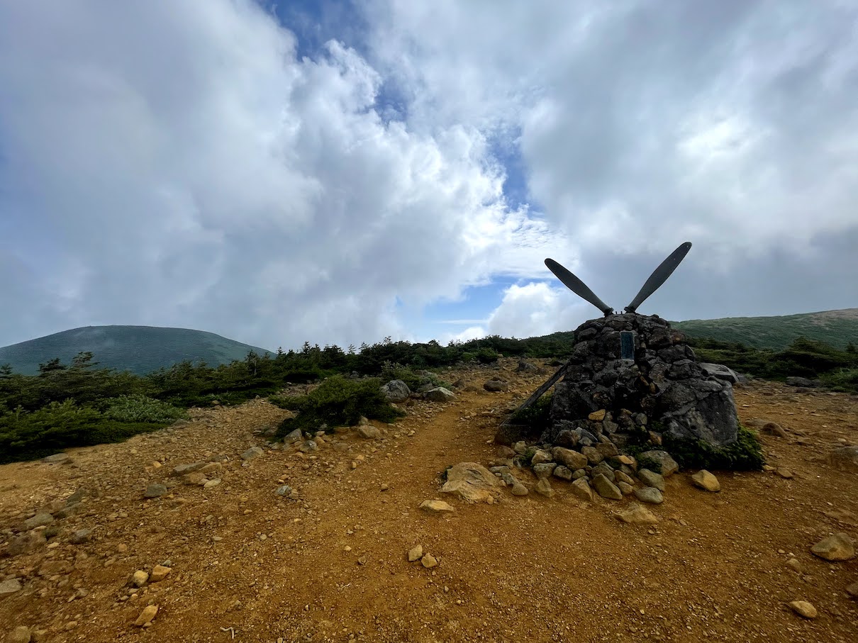 Auf dem Weg Zurueck zum Numajiri Trailhead 沼尻登山口 kommt man an einem Gedenkstein vorbei aus dem 2 Propeller ragen. Der sogenannte Shakunage Turm 石楠花の塔 soll an den Hubschrauberabsturz an der Stelle der japanischen Selbstverteidigungsstreitkraefte aus dem Jahr Showa 33 (1958) erinnern.