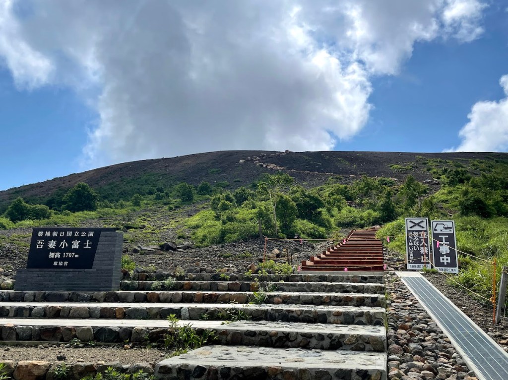 Als einer der wohl markantesten Berge des Azuma Bergmassivs und gleichzeitig auch als leicht zugaenglich gilt der Azuma-Kofuji 吾妻小富士 (j. Azuma “kleiner Fuji”). Dieser ist ein sehr schoen geformter Vulkankrater, den man bis fast ganz nach oben mit dem Auta erreichen kann. Hierzu muss man mit dem Auto auf die Azuma Skyline zum Parkplatz auf der Jyododaira 浄土平, vom wo es dann nurnoch weniger als 10 Minuten bis zum Kraterrand sind.