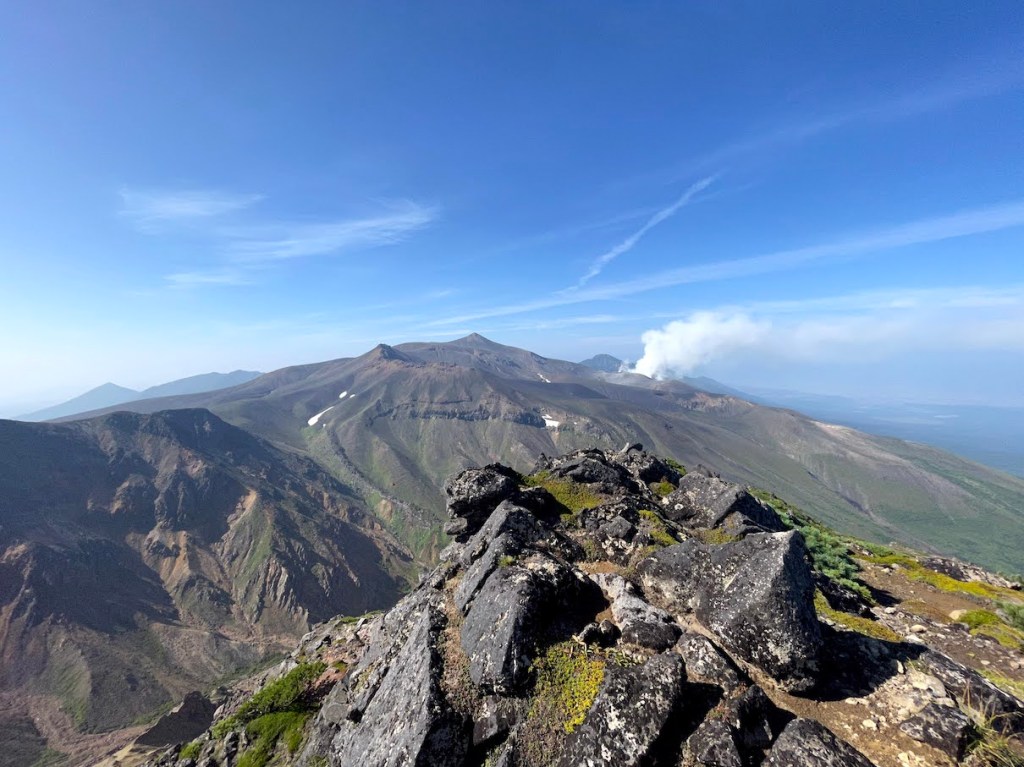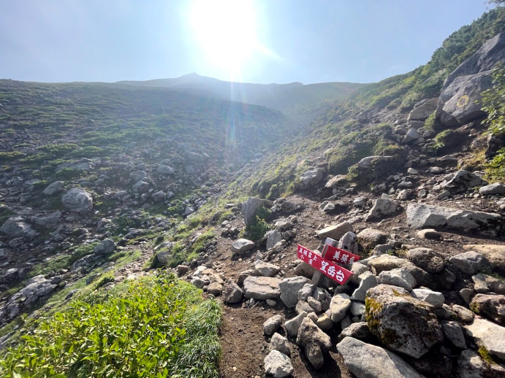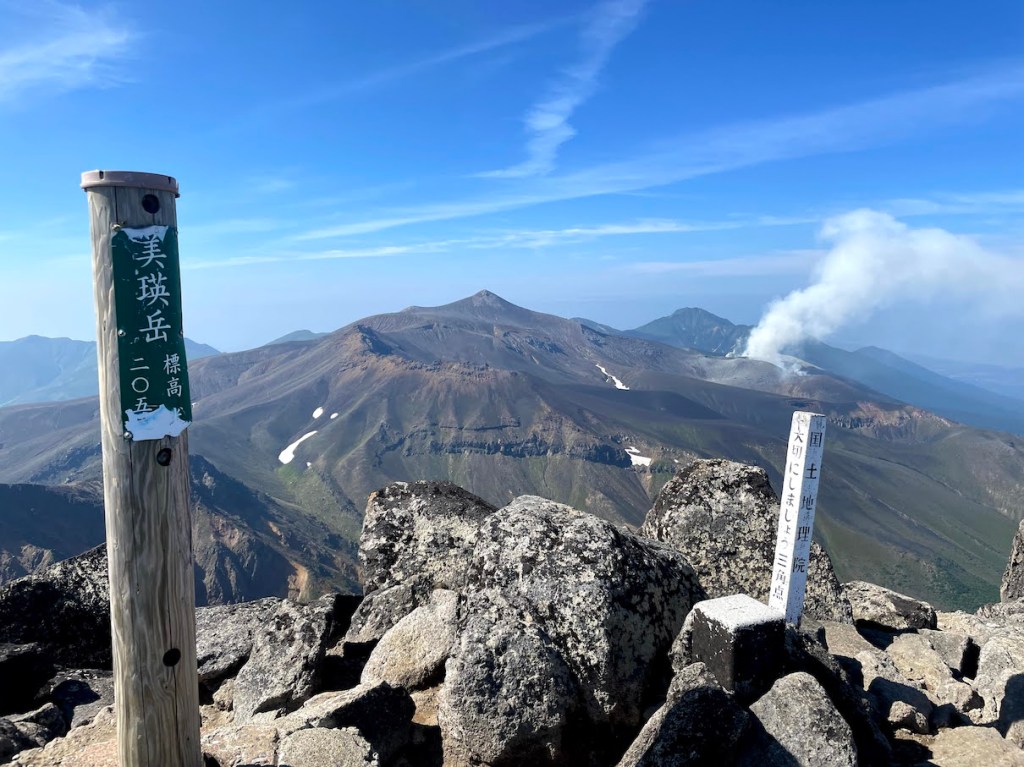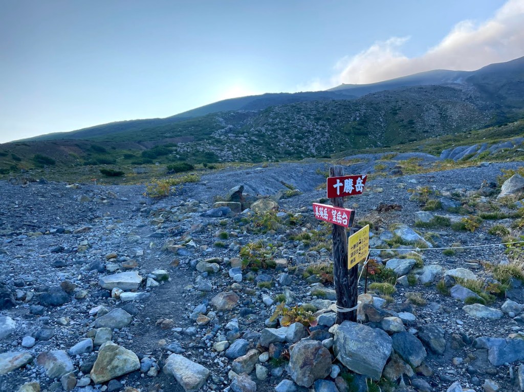 Biei-dake gesehen vom Beginn des Wanderweges, dem Bogakudai 望岳台.Zunaechst geht es richtung Tokachi-dake 十勝岳An dieser Kreuzung links zum Biei-dake 美瑛岳.Frueh morgens zeigen sich Berge meist von ihrer mystischen Seite.Morgendunst in den Bergen.Charakteristisch wie hier liegt teilweise noch schnee auf dem Berg, und das im Hochsommer (August) .Ueber diesen FlussDann ein paar steilere Einlagen.Oben sieht man schon den Gipfel.Der Gipfel des Biei-dake.Tokachi-dake gesehen von einer Stelle kurz vor dem Gipfel des Biei-dake.Der Gipfel des Biei-dake.Gipfel-Schild auf dem Biei-dake.Provisorische Beweisphoto.In die andere Richtung erblickt man den etwas kleineren Biei-Fuji.
