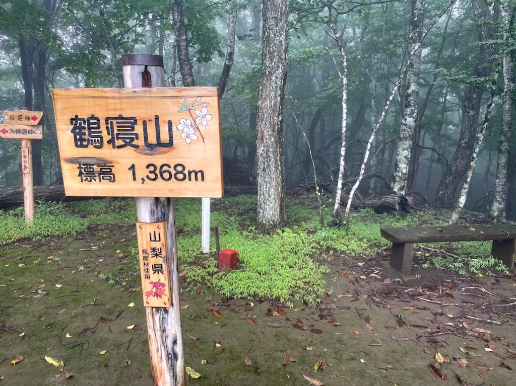 Oben angekommen gibt es unweit des Gipfelschildes ein Aussichtsort 展望所, von dem man eine formidable Sicht auf den Fuji-san haben soll (deshalb ist der Berg auch gelistet unter den 12 beruhmten Fuji-Sichten der Stadt Otsuki). Am Tag wo wir oben waren hat es leider geregnet und es war sehr trueb. Man hat also nichts gesehen.