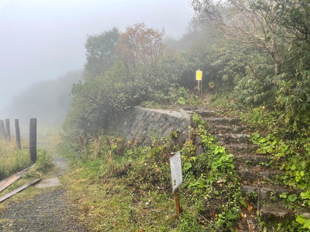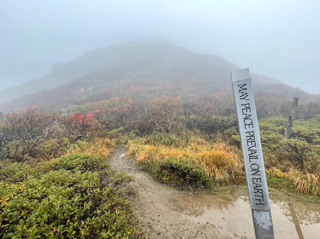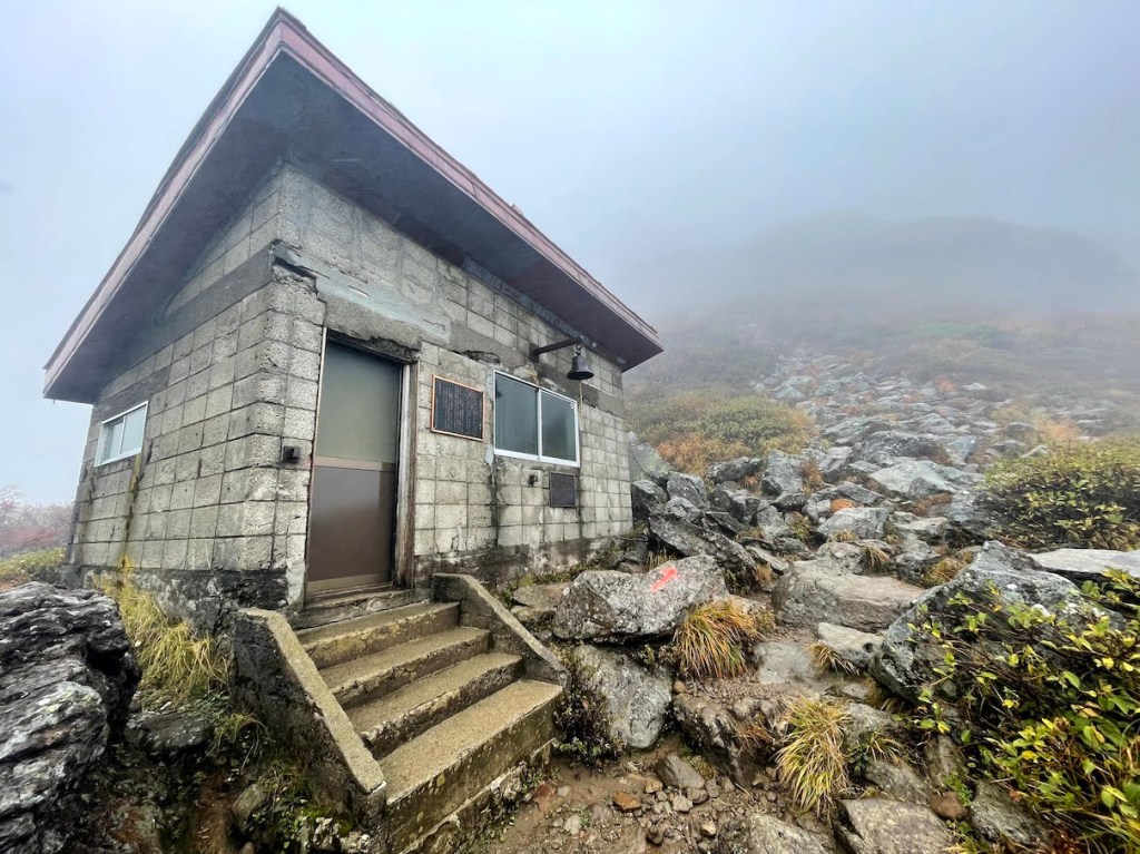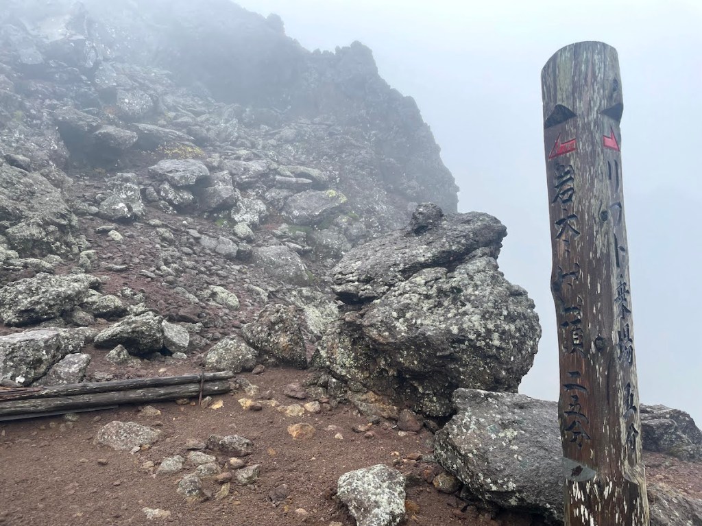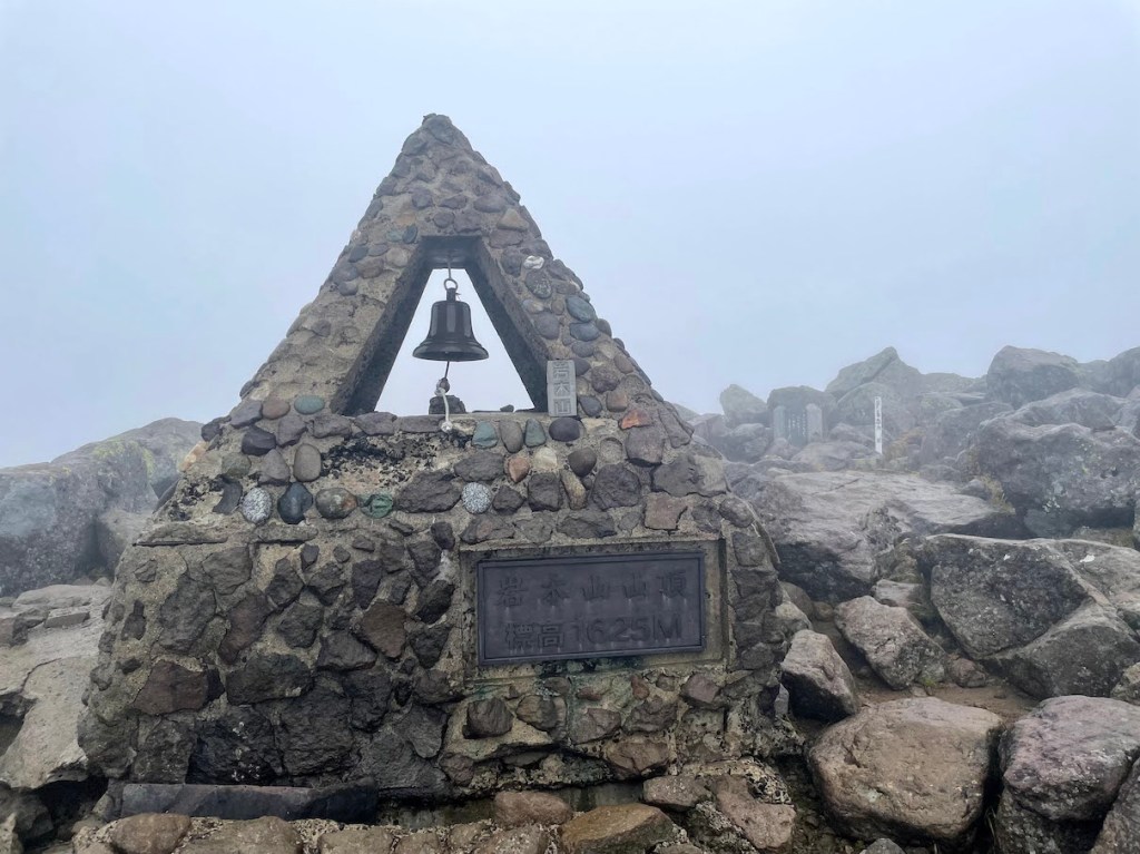 Oben angekommen findet man die Gipfelmarkierung in Form einer Steinpyramide, sowie eine unbemannte Huette und einen Shinto-Schrein. Bei guter Witterung hat man von oben ein 360 Grad Sicht auf die Tsugaru Ebene. Als ich dort ankam hat es leider schon ziemlich angefangen zu regnen und die Sicht blieb mir verwehrt, obwohl es kurz vorher im Tal noch sonnig war. Eine weitere Erinnerung daran, dass das Wetter in den Bergen unberechenbar ist und man immer die Regensachen dabei haben sollte, wie ich auch and diesem Tag (zum Glueck).