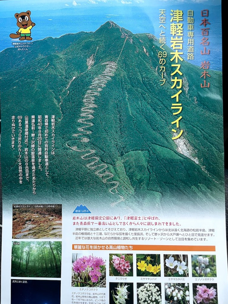 | Anfahrt: | Ueber die Tsugaru Skyline mit dem Auto (Zugang kostet 1860 Yen), dann entweder zu Fuss besteigen (1.5h bis zum Gipfel) oder weiter mit dem Lift und dann nur noch ca. 0.5h bis zum Gipfel. |