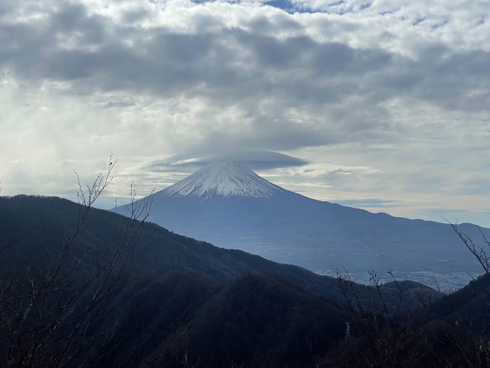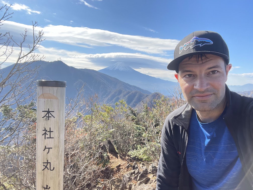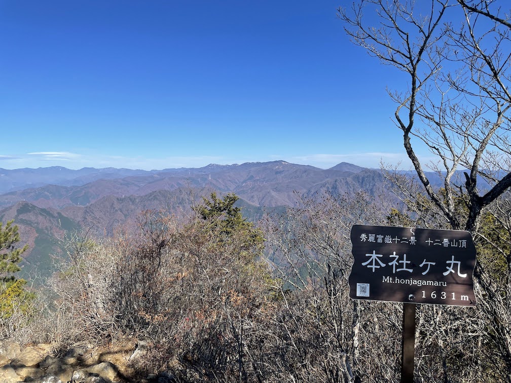 Nach der naechsten Steilen Etappe dann schlieslich erreiht man den Tsunotogi-yama 角研山, ab welchem man auf der Ridgelien angekommen ist. Von hier aus kann man bereits den Honjagamaru sehen auf der rechten Seite. Wandert man die Ridgeline nun rechts entlang kommt man sehr bald auf die erste freie Flaeche mit einem grossen Strommast, von der man eine gute Sicht auf den Mitsutoge-yama auf der linken Seite sowie die Berge noerdlich von Sasago Station auf der rechten Seite hat. Von hier aus dann weiter entlang der Ridgeline und nach ca einer halben Stunde erreicht man auch schon den Gipfel das Honjagamaru. Der leicht felsige Gipfel ist relativ frei und man hat eine gute Sicht auf den Mitsutoge-yama mit seinen markannten Antennen, Fuji-san, die japanischen Alpen, sowie im Norden das Yatsugatake Gebirge. Faszinierend fand ich, dass an dem Tag an dem ich dort war so gut wie niemand anders dort war. Erst nach einer ganzen Weile kam ein anderer aelterer Japaner auf dem Gipfel an, von er anderen Seite.