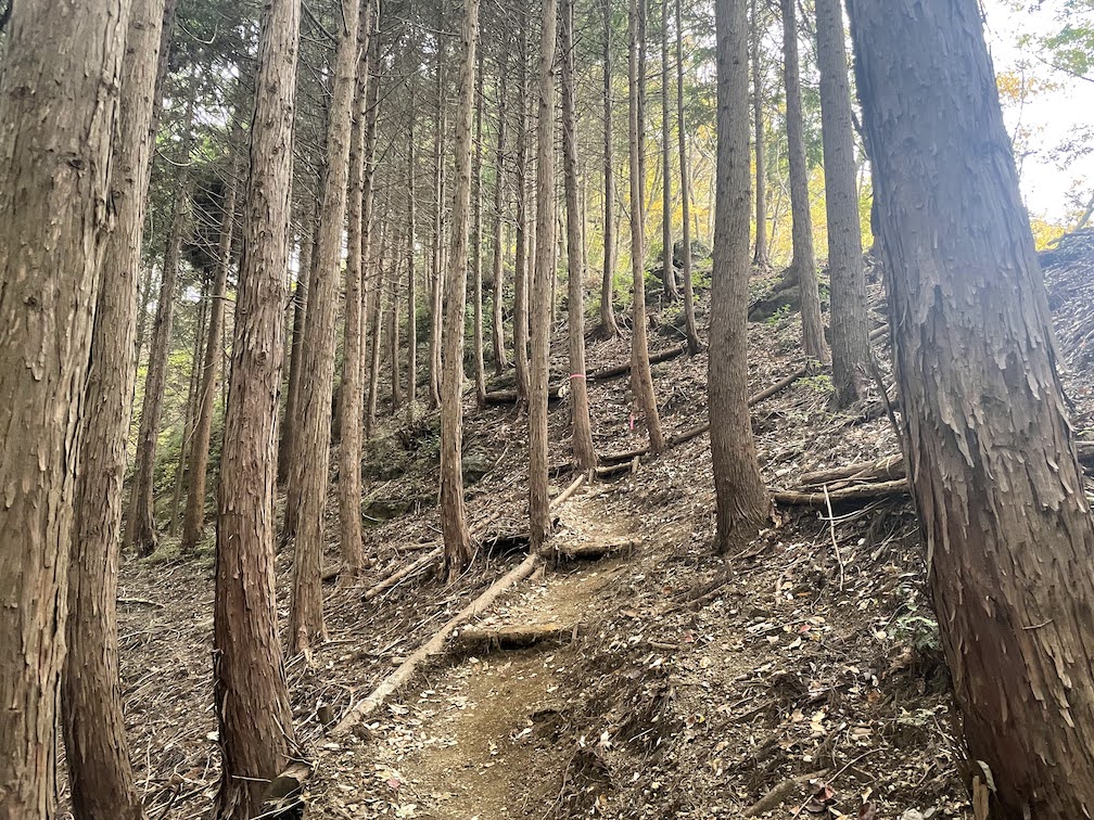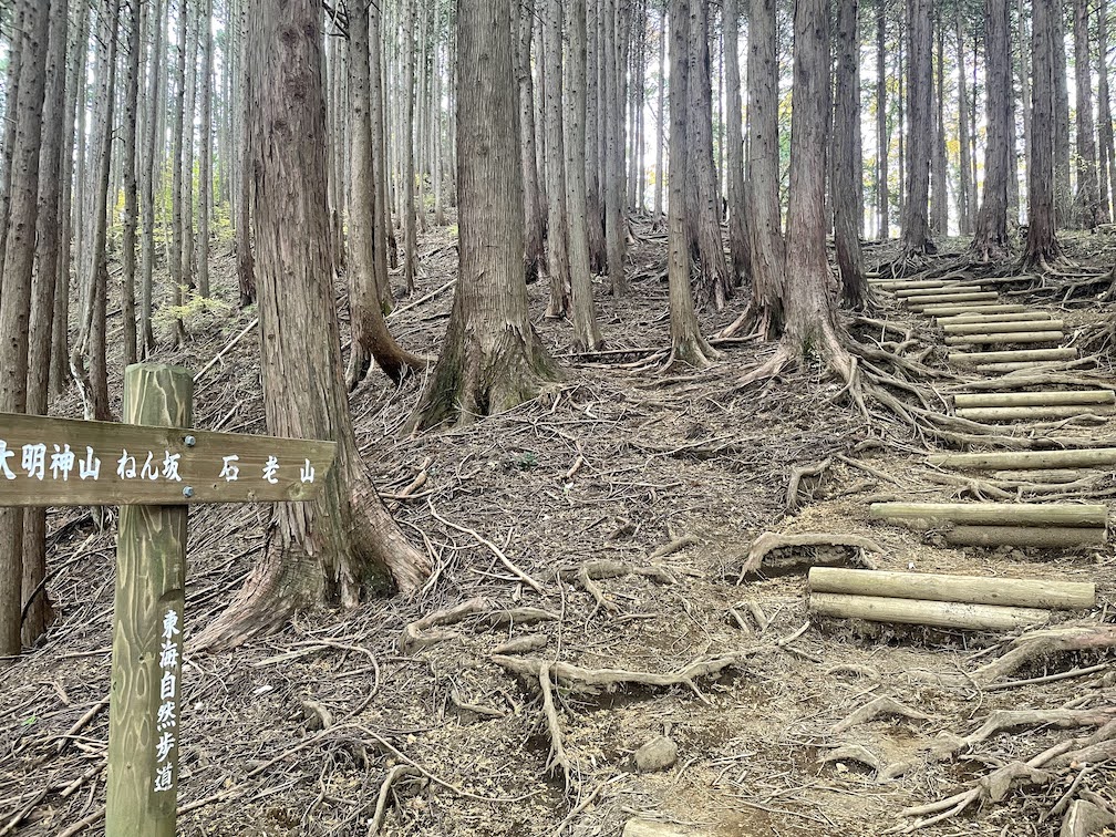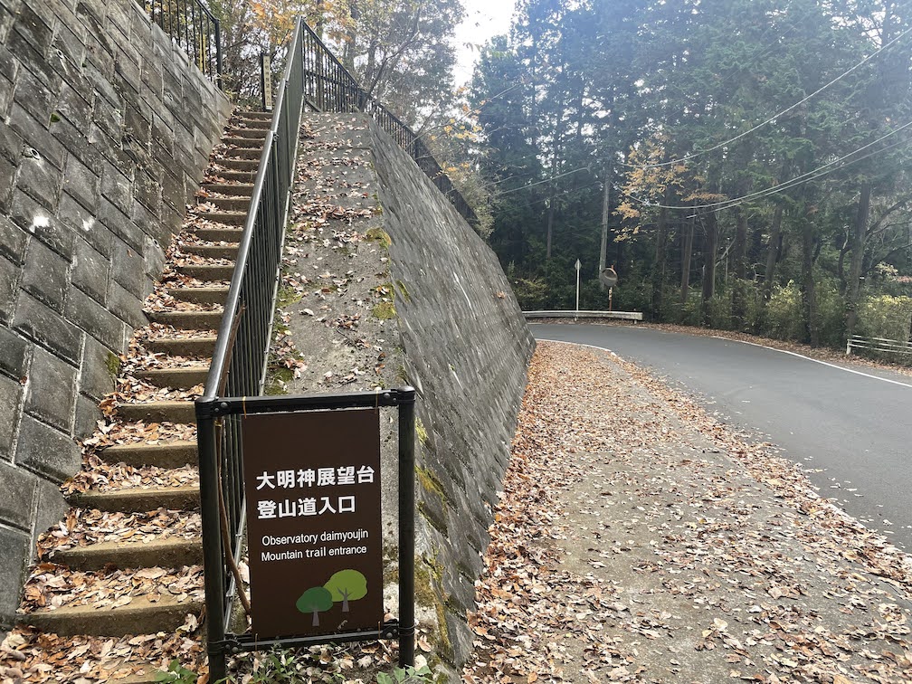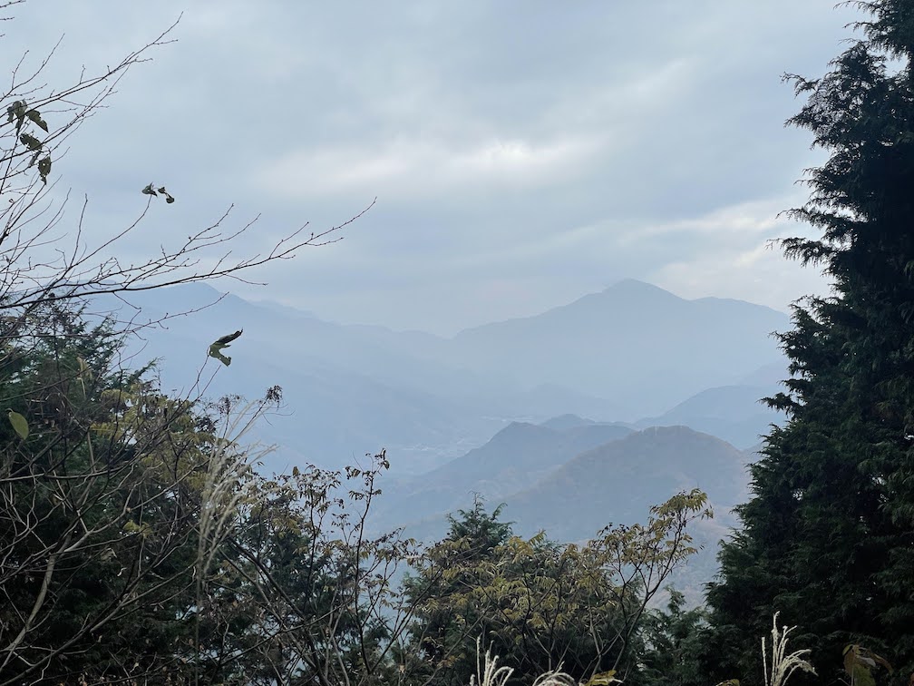 Im Jahr 2019 gab es einen schweren Taifun in Japan, welcher einfach nur mit “Nummer 19” abgekuerzt wird (in Japan werden dei Taifune jaehrlich durchnummeriert). Dieser Taifun Nummer 19 war derart stark, dass er einige Wanderpfade in der Kanto Region stark beschaedigt hat. So leider auch einige der Pfade am Sekirou-zan. Daher muss man erst eine Weile rechts um den Berg an der Strasse laufen, bis man zu einem sicheren Aufstiegspfad kommt. Fuer diesen folgt man den Schildern zum Daimyojin-Tenboudai 大明神展望台 (Aussichtspunkt des Daimyojin). Vom Eingang geht es wieder relativ steil nach oben bis man auf besagtem Aussichtspunkt angekommen ist. Der Aussichtspunkt ist eine dort gebaute Platform mit ein wenig Aussicht auf das Umland, aber nicht allzu berauschend. Von dort aus geht es weiter ueber zwei weniger bekannte Spitzen (den Daimyojin-yama 大明神山 kurz hinter der Aussichtsplatform mit dem gleichen Namen) sowie den Shinonome-yama 東雲山. Letzteres Kanji fand ich sehr interessant, ist es doch eine besondere Lesung (ich haette wohl eher Tou-un vermutet). Shinonome, wie ich gelesen habe, ist ein altes japanisches Wort, welches das Rot-Faerben des Himmels zur Zeit den Sonnenaufgangs beschreibt. Die Kanji Bedeutung ist Ost 東 und Wolke 雲. Sehr poetisch.
