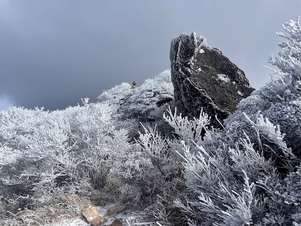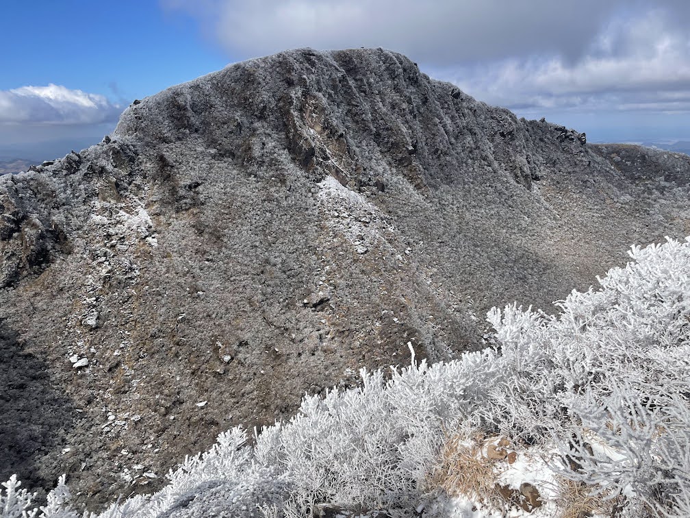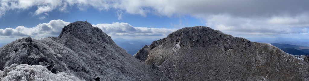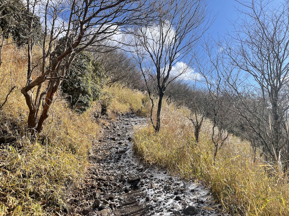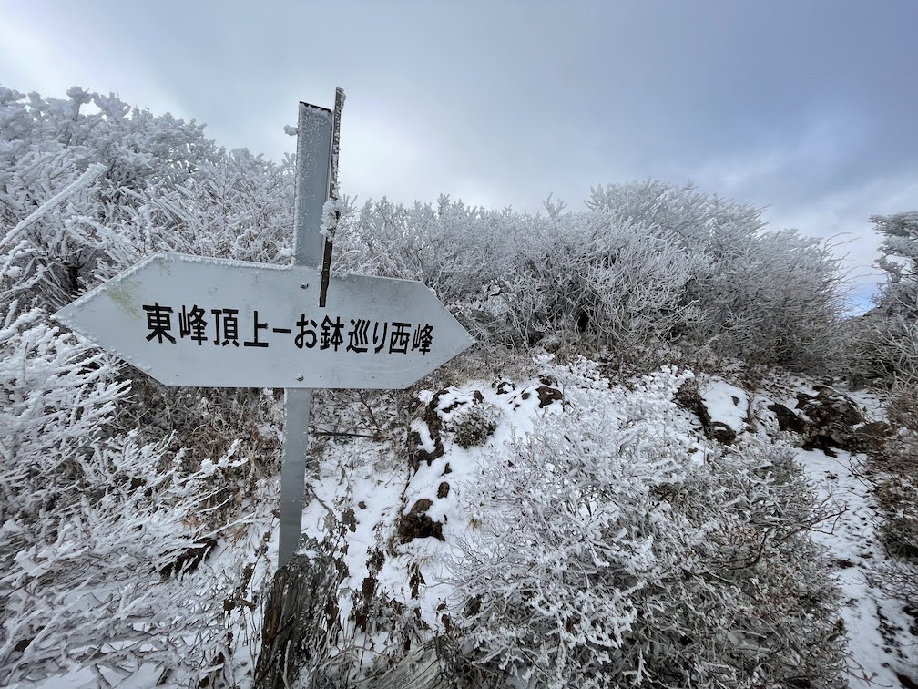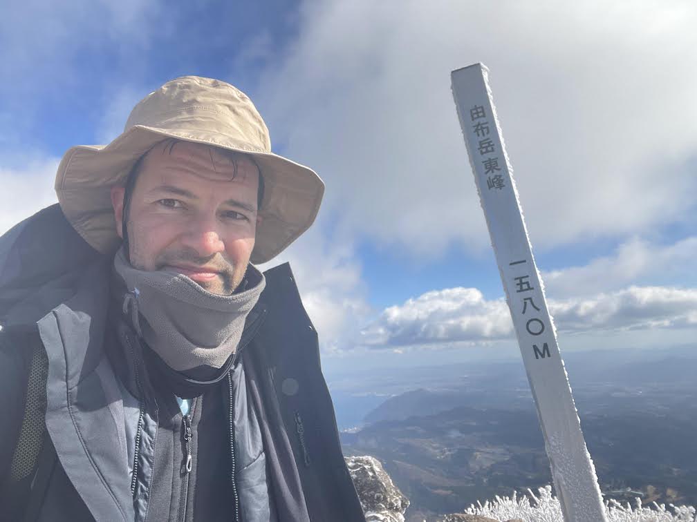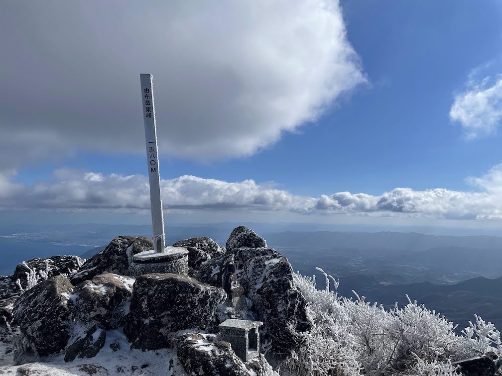 Zurueck zum Yufu-dake. Der Vulkan mit seinen zwei Spitzen ist das Landmark der Onsen Stadt Yufuin. Routen nach oben gibt es mehrere. Ich entschloss mich, die am einfachsten zu erreichende Route von Beppu anzupeilen. Da ich fruehs erst mit dem Flugzeug in Oita gelandete bin, musste ich noch knappe 2h bis zum Trailhead 登山口 fahren. Dort angekommen erblickte ich den imposanten Vulkan mit seiner Doppelspitze. Es war Anfang Dezember und im Jahr davor war ich schon einmal in Kyushu wandern, gegen Ende Dezember, ohne Schnee. Dieses Jahr war es allerdings schon frueher wesentlich kaelter und man sah schon von unten dass der Gipfel des Berges mit Schnee belegt ist. Nun gut, auf Schnee war ich nicht vorbereitet, aber auf Kaelte schon.