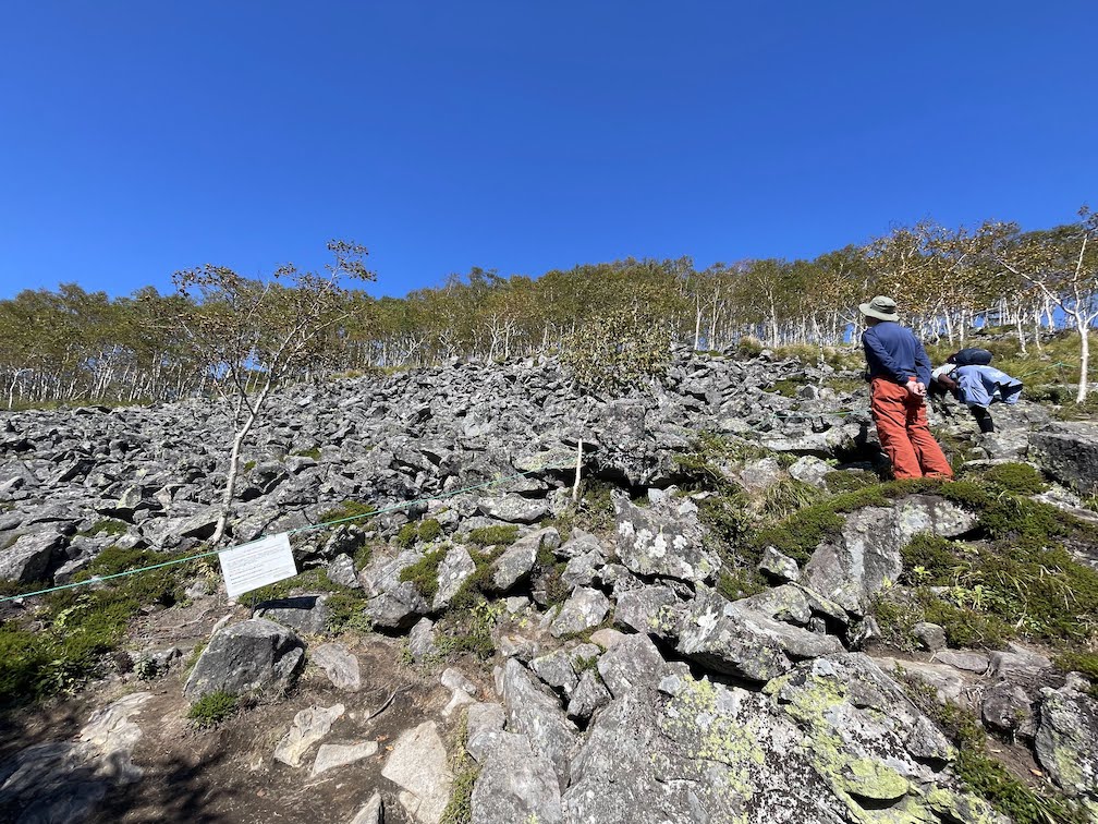 Vom eigentlichen Gipfel kann man leider nichts gut sehen, da er bewachsen ist. Jedoch kann man auf die Tokachi Ebene blicken, wenn man noch ein wenig weiter hinter den Gipfel laeuft. Ausserdem gibt es noch ein steiniges Gebiet ca. 5 Minutem hinter dem Gipfel, das von Berghasen ナキウサギ (dt. “Pfeifhasen”) bewohnt ist, so dass man, wenn man Glueck hat, dort einige antreffen kann. Ich habe von diesem Ort nur durch Zufall erfahren. Eine junge Frau kam mir entgegen und fragte ob ich bereits die Hasen gesehen haette, denn sie hat gleich 2 erblickt. Danach schickte sie mich die 5 Minuten weiter, wo ich aber dann allerdings kein Glueck mehr hatte. Nunja, zurueck zum Gipfel und nach ca. 40 Minuten war ich auch schon wieder unten. Alles in allem ein netter Halbtages-Hike.
