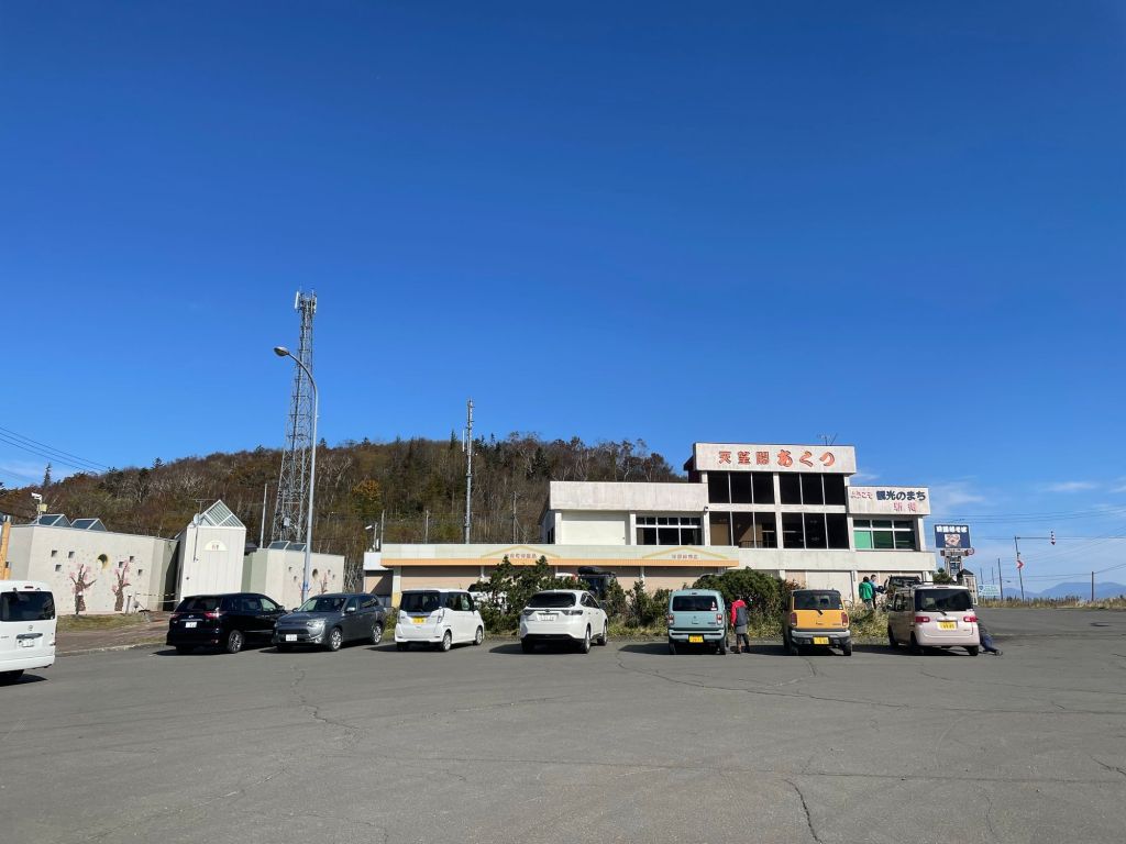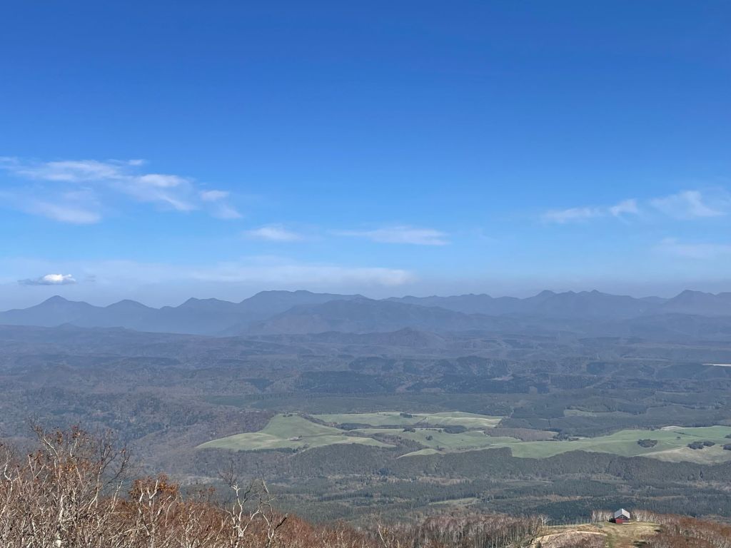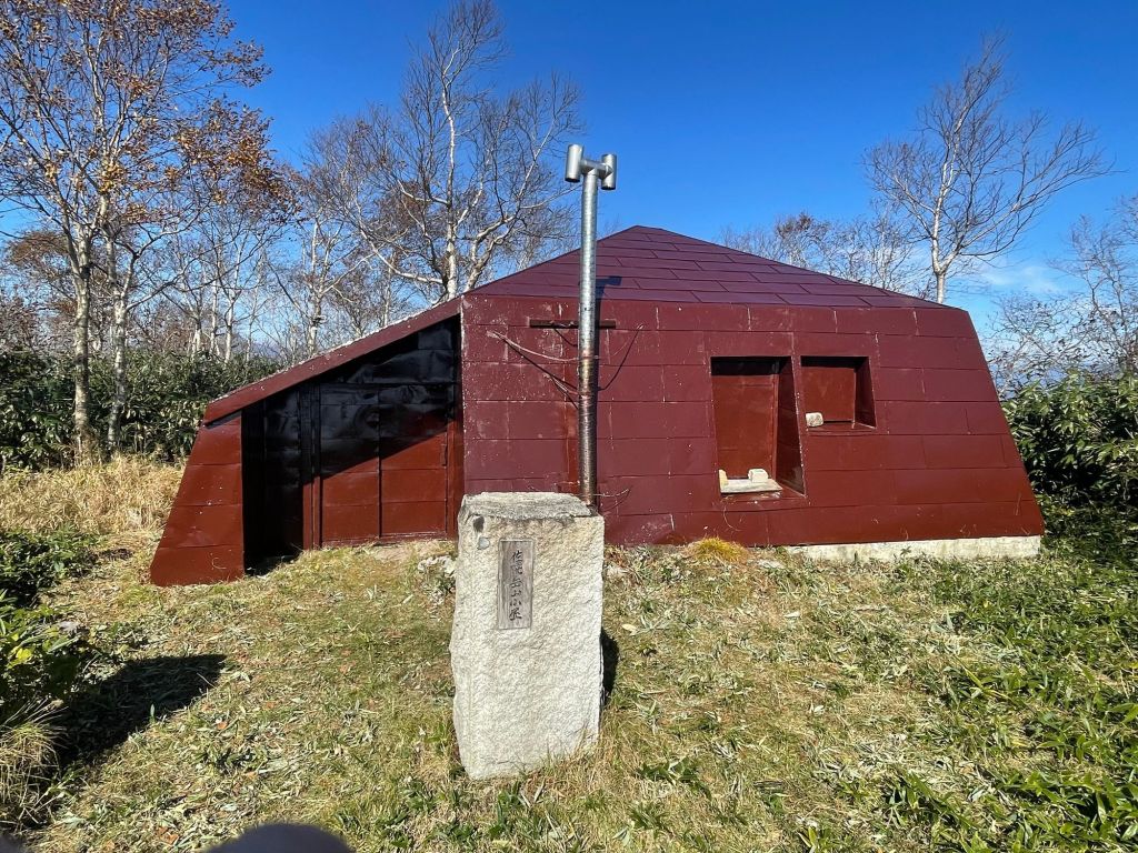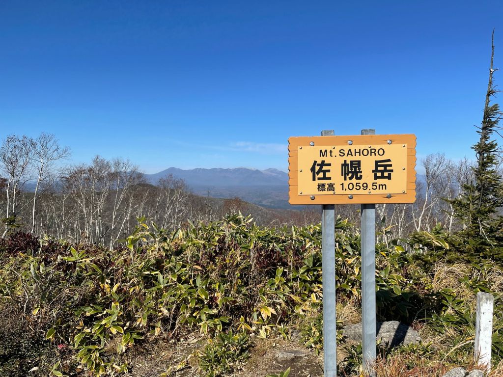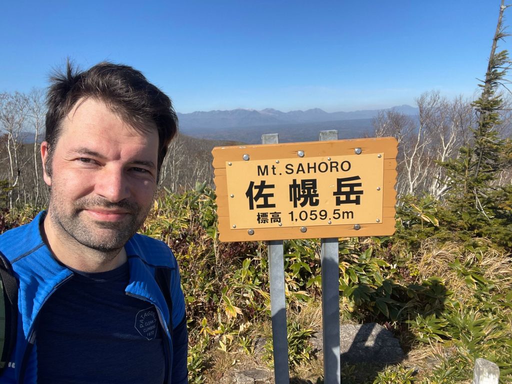 Kurz vor dem Gipfel gibt es eine (kleine) Berghuette. Ein aelteres Ehepaar, dass ich auf dem Weg getroffen habe meinten, sie haetten die Nacht in dieser Huette verbracht. Nur ein paar Minuten hinter der Huette befindet sich der Gipfel des Sahoro-dake. Der Berg ist mit leicht ueber 1000m nicht allzu hoch, jedoch bietet der relativ freie Gipfel eine tolle Aussicht auf das Umland. Man kann das Hidaka Gebirge 日高連山 sehen, das Daisetsu-zan Gebirge 大雪山連山, sowie die Berge um den Shikaribetsu See 然別湖. Mitte Oktober war ein perfekter Herbsttag fuer niedrigere Berge wie den Sahoro-dake. Einige Spitzen des Daisetsuzan Gebirges wie der Tokachi-dake 十勝岳 und der Asahi-dake 旭岳 besassen zu der Zeit schon eine leichte Schneekrone.