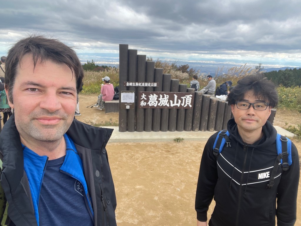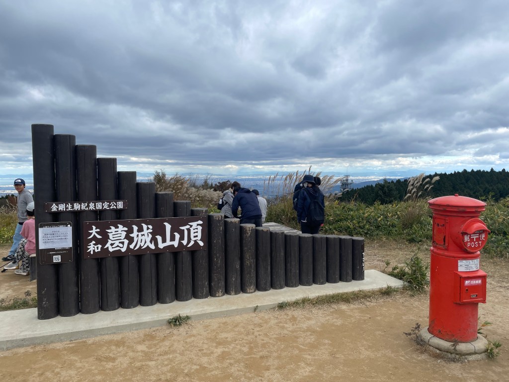Der Gipfel des Yamatokatsuragi-san ist sehr weitlaeufig, bietet Aussicht auf den benachbarten Kongo-san sowie in die Richtung Nara sowie Osaka Bucht. Auf dem Gipfel befindet sich auch eine Post-Box direkt neben der Gipfelmarkierung, die ausschaut wie ein statistischer Balken-chart. Da der Gipfel relativ frei ist, spuert man dort Wind und Kaelte stark im Herbst und Winter, so dass die meisten nach kurzem Besuch in die etwas geschuetztere Gegend bei den Gebaeuden aufhaelt. Das Restaurant dort oben hat typische Berggerichte (Soba/Udon mit Sansai [Berggemuese], Curry, etc). Es gibt dort auch eine relativ grosse Terasse, wo ich mir vorstellen kann, dass es relativ nett ist im Sommer wenn es etwas waermer ist.