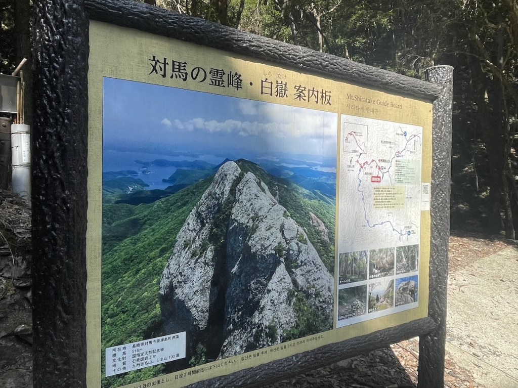 Tsushima 対馬 ist eine Insel zwischen Korea und Japan, die administrativ zur Praefektur Nagasaki gehoert. Die Insel is sehr bergig. So bergig, dass es so gut wie keine geraden Strassen gibt. Der hoechste Berg auf Tsushima ist der Shira-take 白嶽 (aka Sumoshira-take 洲藻白嶽). Der 518m hohe Berg liegt auf der suedlichen Seite von Tsushima und der Beginn des Wanderweges ist nur via Auto zu erreichen. Wie immer empfiehlt es sich frueh da zu sein, denn der Parkplatz ist relativ klein und kann keine 10 Autos beherbergen.