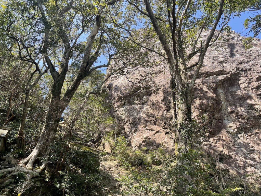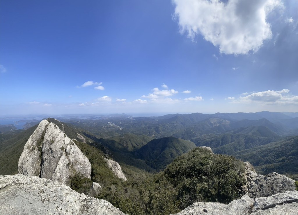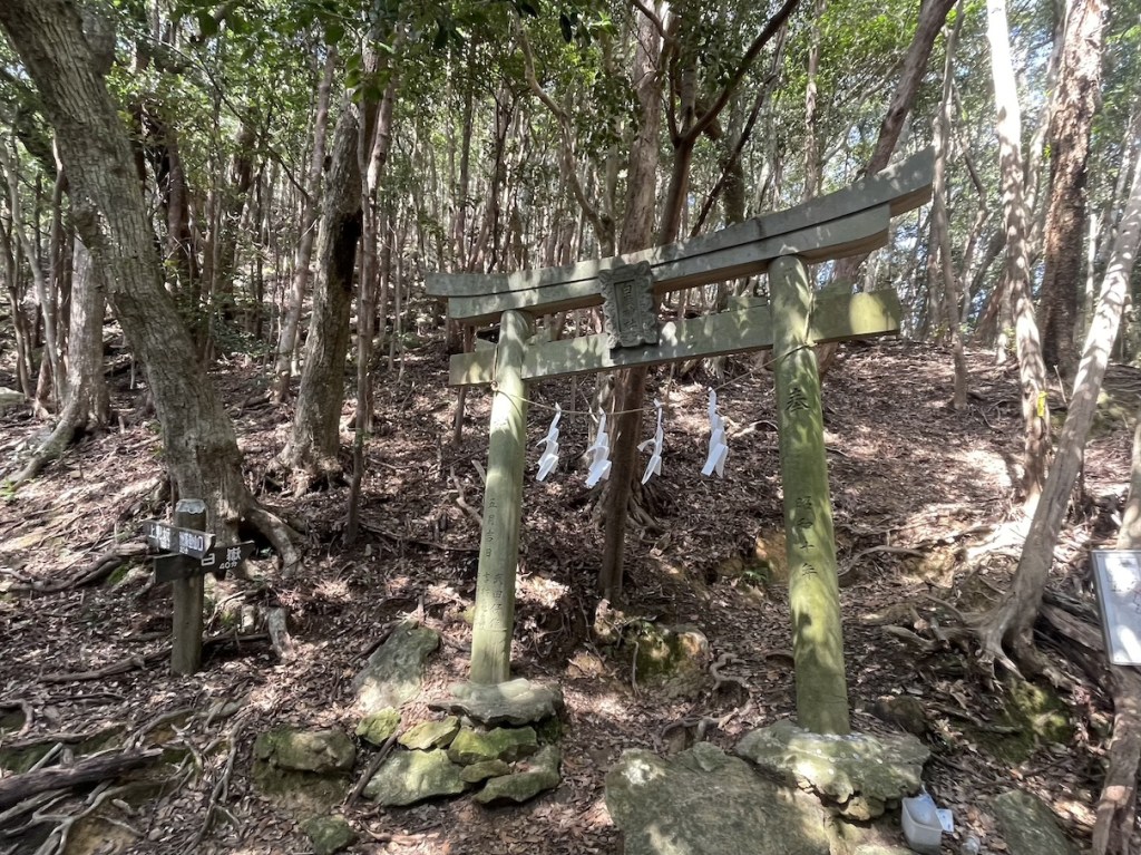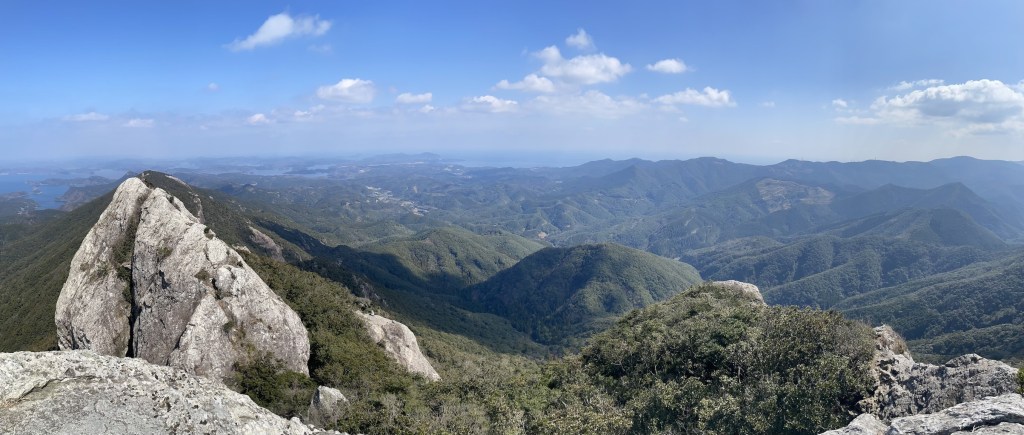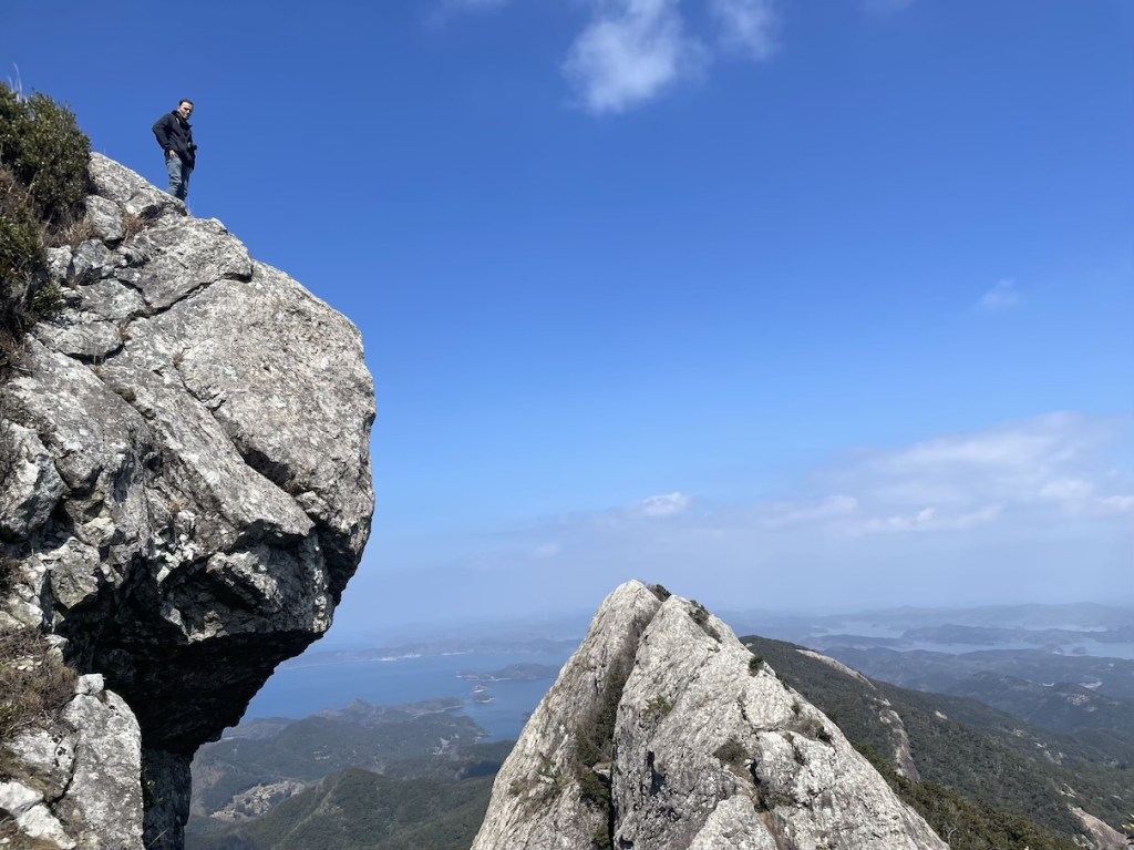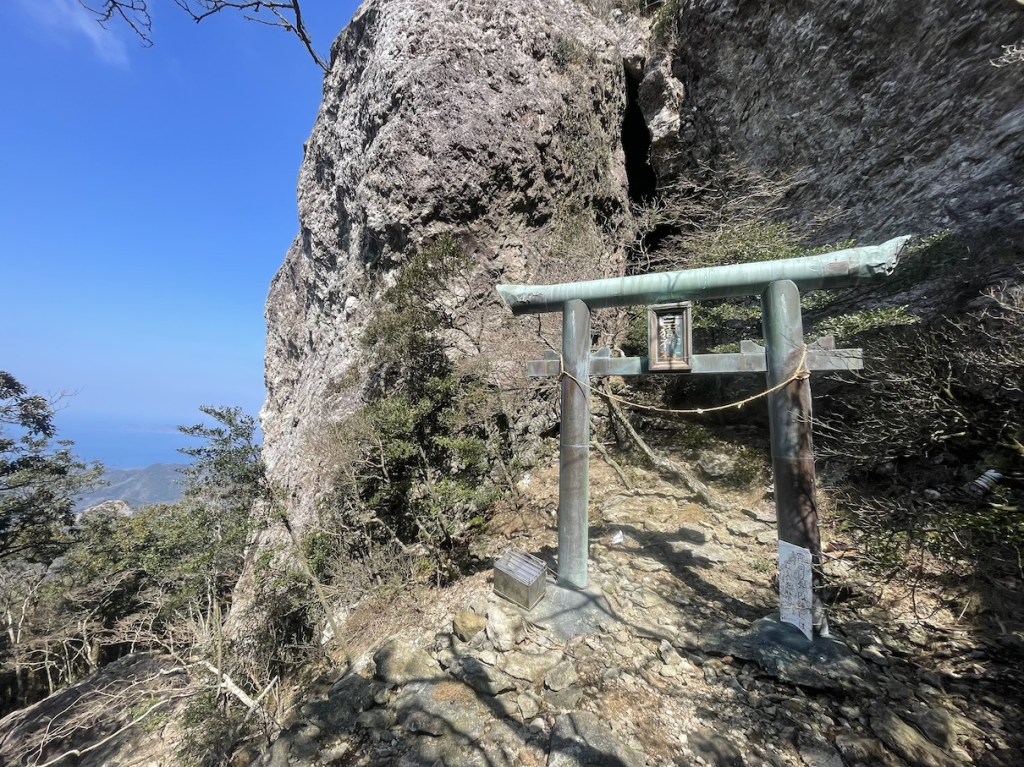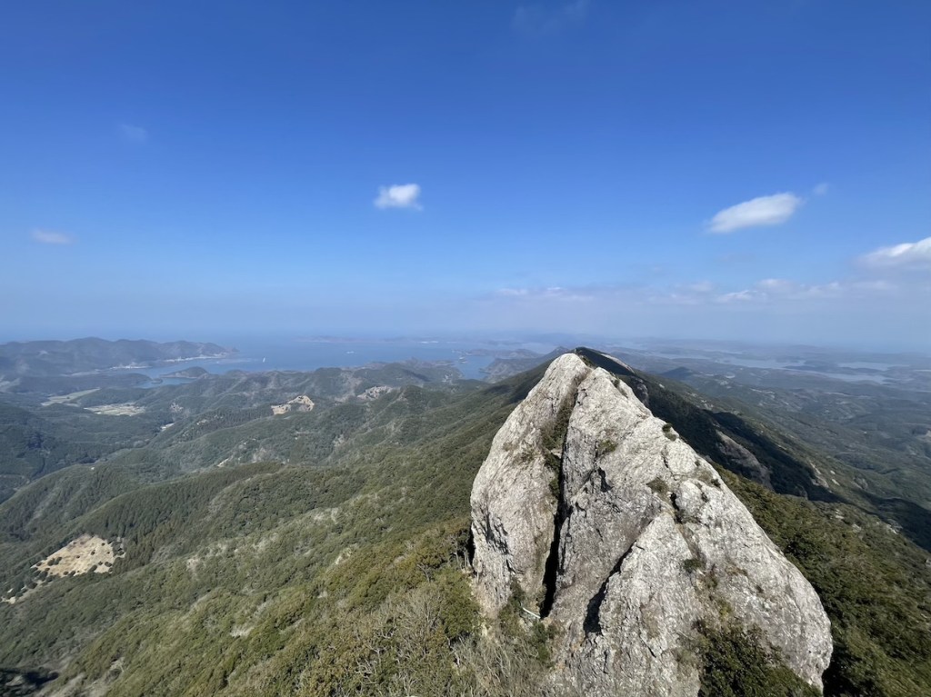 Der Weg nach oben ist relativ einfach und dauert nicht allzu lang (~1,5h). Auf halbem Weg befindet sich ein Torii 鳥居, denn in Gipfelnaehe befindet sich, wie so oft in Japan, auch ein Schrein. In der Naehe des Gipfels wird es sehr felsig und man sieht den markannten Gipfelfels schon beim Aufstieg. Eigentlich sind es Zwillingsfelsen, von denen man auf einen mit ein wenig Anstrengung klettern kann. Das letzte Stueck ist durchaus ein wenig Steil und man sollte sich genug Zeit lassen und seine eigene Risikogrenze kennen. Es gibt 1-2 Stellen, die sind fuer ungeuebte vielleicht ein wenig zu riskant. Die meisten sollten aber keine Probleme haben hochzukommen. Oben angekommen kann man eine tolle Aussicht ueber die Insel geniessen, vom benachbarten Zwillingsfelsen, die bergige Landschaft der Insel, sowie die vielen Seen und Fjorde, die diese Insel ausmachen. Hinter dem zweiten der Zwillingsfelsen (dort wo man nicht hoch kommt) befindet sich der besagte Bergschrein leicht versteckt. Der kurze Abstecher von nur ca. 5 Minuten ist es aber definitiv Wert vorbeizuschauen.