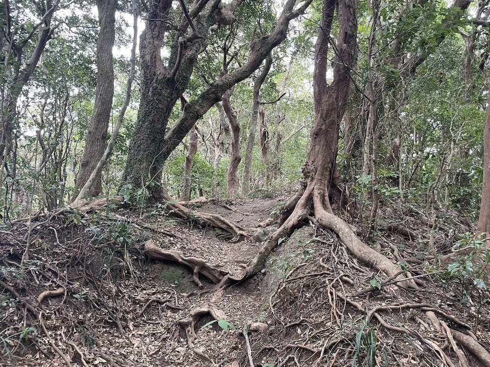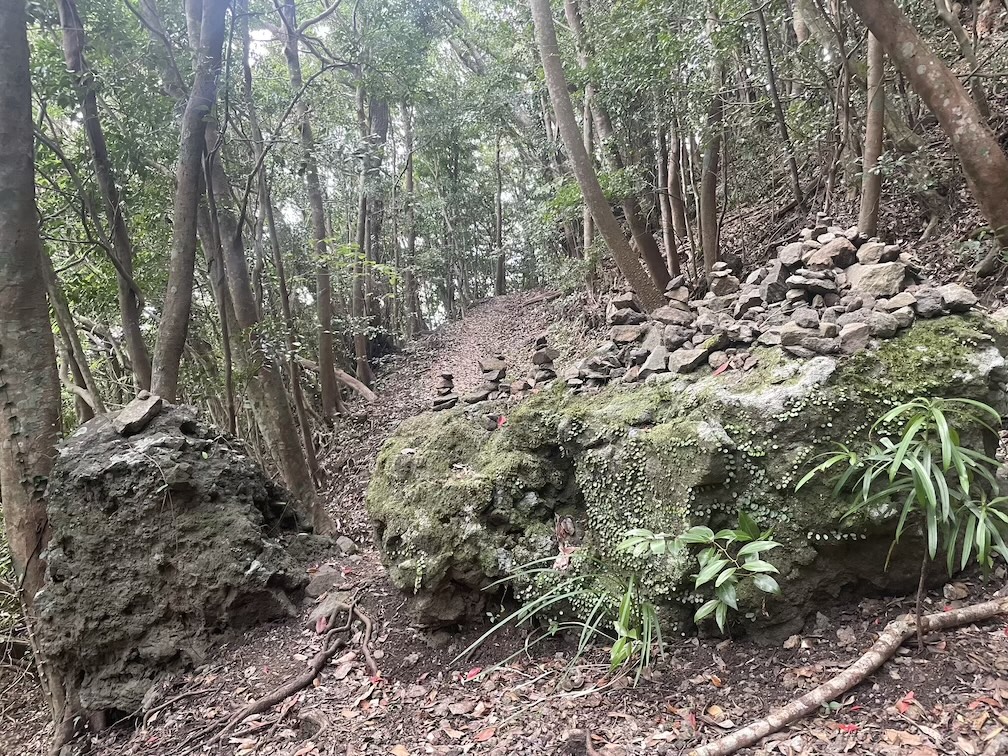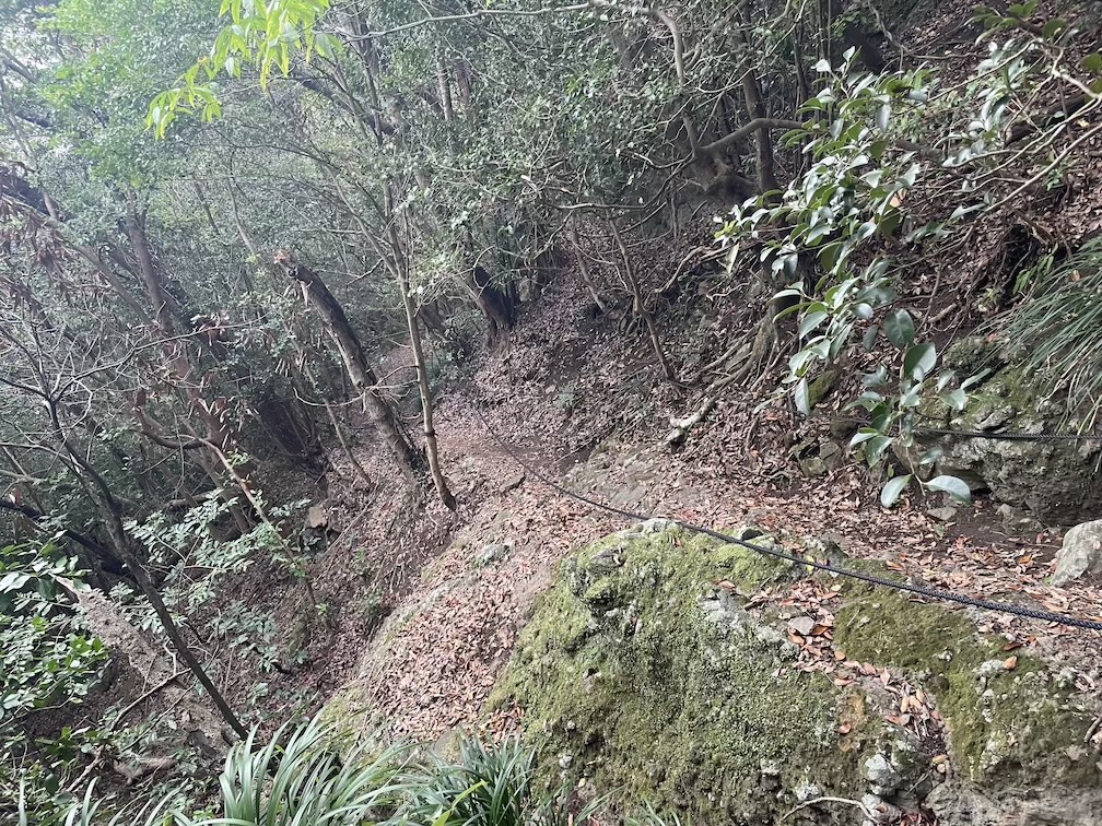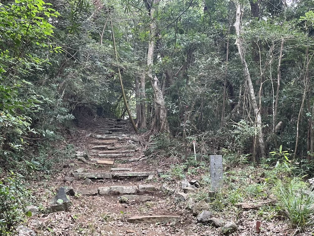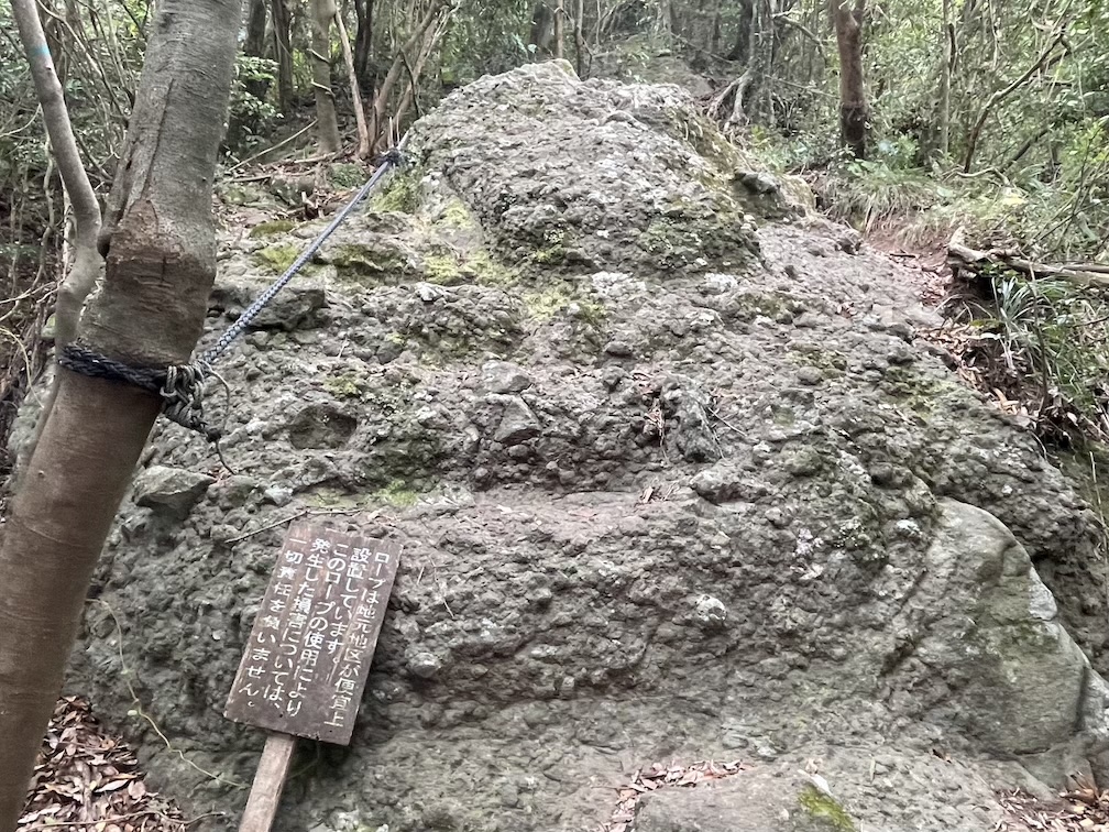 Am Berg angekommen befindet sich ein mittelgrosser Parkplatz der ca. 20 Autos fasst. Vom Parkplatz aus kann man bereits den Gipfel des moderat hohen Berges sehen: ein imposanter Felsen der geradezu aus dem Berg herausragt. Um es dort hoch zu schaffen muss man zunaechst an einem Schrein im Wald vorbei, dem Shijiki Schrein (志々伎神社, 志志伎神社, oder 志自伎神社 gelesen) und geraet schliesslich auf den Pfad auf den Berg. Der Aufstieg ist mit ca. einer Stunde nicht sehr lang, jedoch gibt es einige Stellen die ein wenig steiler sind, wo es aber stets Seile und Ketten gibt, wo man sich festhalten kann. Manchmal ist der Weg durch den Wald ein wenig schmal und man muss dort auch aufpassen nicht abzurutschen. An den meisten dieser Stellen gibt es auch Seile zum festhalten.