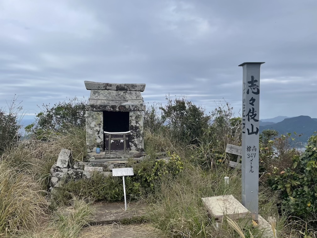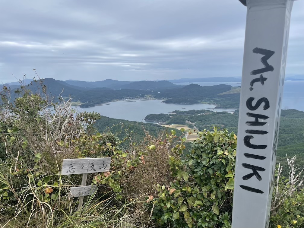 Um auf den Felsen am Gipfel zu kommen muss man erst einmal um den Felsen herum wandern und kann dann von der Hinterseite hoch. Kurz vor dem Gipfel wird die Sicht freier und oben erwartet einem ein kleines Gipfelplateau auf dem sich ein kleiner Schrein befindet sowie die Gipfelschilder (sowohl auf Japanisch als auch auf English). Die Sicht vom Gipfel ist an klaren Tagen sehr schoen, denn man kann in alle Richtungen auf die Insel und das Meer schauen. Alles in allem ein zu empfehlender Hike, wenn man in der Naehe von Hirado ist, ein Auto hat und ein wenig Zeit mitbringt.