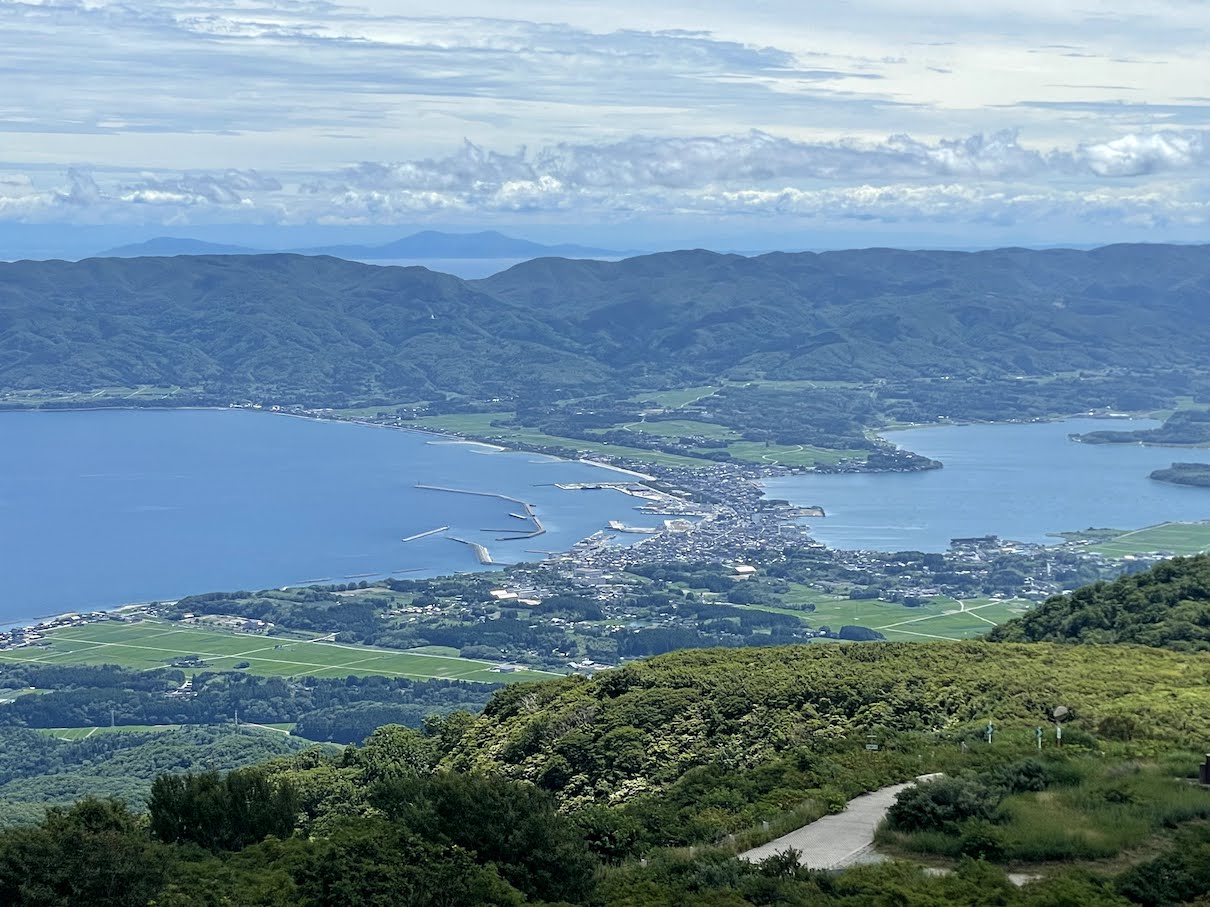 Der Weg nach oben ist relativ einfach und dauert nicht allzu lang (~1,5h). Auf halbem Weg befindet sich ein Torii 鳥居, denn in Gipfelnaehe befindet sich, wie so oft in Japan, auch ein Schrein. In der Naehe des Gipfels wird es sehr felsig und man sieht den markannten Gipfelfels schon beim Aufstieg. Eigentlich sind es Zwillingsfelsen, von denen man auf einen mit ein wenig Anstrengung klettern kann. Das letzte Stueck ist durchaus ein wenig Steil und man sollte sich genug Zeit lassen und seine eigene Risikogrenze kennen. Es gibt 1-2 Stellen, die sind fuer ungeuebte vielleicht ein wenig zu riskant. Die meisten sollten aber keine Probleme haben hochzukommen. Oben angekommen kann man eine tolle Aussicht ueber die Insel geniessen, vom benachbarten Zwillingsfelsen, die bergige Landschaft der Insel, sowie die vielen Seen und Fjorde, die diese Insel ausmachen. Hinter dem zweiten der Zwillingsfelsen (dort wo man nicht hoch kommt) befindet sich der besagte Bergschrein leicht versteckt. Der kurze Abstecher von nur ca. 5 Minuten ist es aber definitiv Wert vorbeizuschauen.