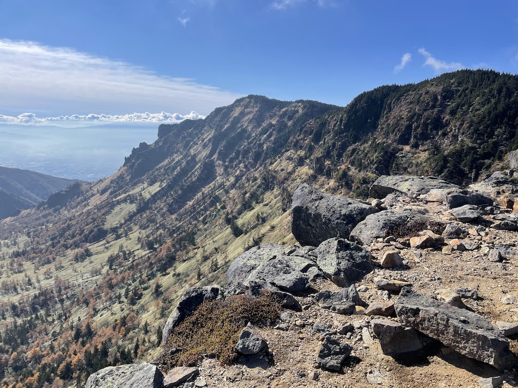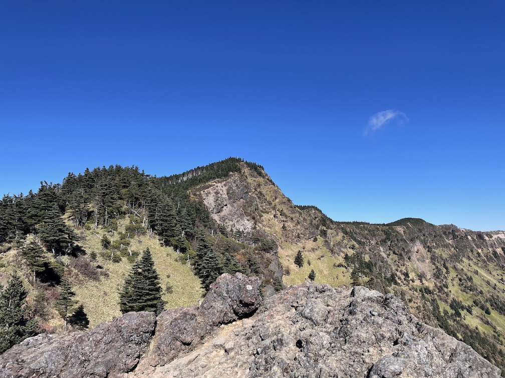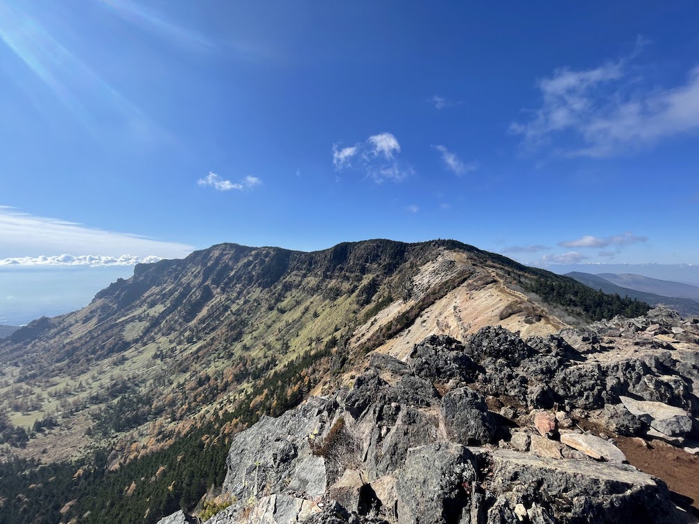 Auf dem Rueckweg kann man noch einen kleinen Abstecher zur benachbarten Spitze des Ichinokoshi 一ノ腰 machen. Der Abstecher dauert ca. 1h fuehrt aber dafuer auch an einem Bergschrein sowie dem Kanmuri-iwa 冠岩 vorbei, einem imposanten grossem Stein/Fels. Allen in allem ist der Berg sehr zu empfehlen. Als einer der 200 beruehmten Berge von Japan 日本二百名山 sowie als einer der ausgewaehlten 100 Blumenberge von Japan 花の百名山 ist er auch reich an abwechslungreicher Fauna.