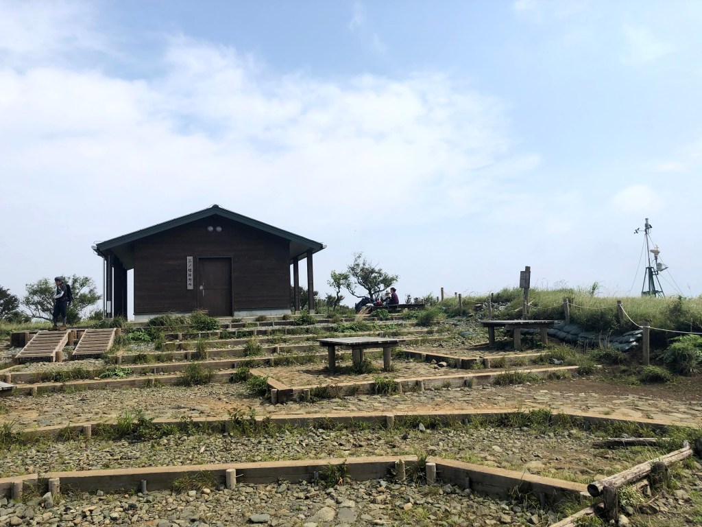 Kurz vor dem eigentlichen Gipfel den Shiro-yama 城山 gibt es links eine kleine Eben mit Aussicht auf die Umgebung, vielen Ajisai Blumen 紫陽花 und einer ueberdachten Raststaette aus Holz in Pyramidenform. Weiter den Wanderweg entlang kommt man schliesslich auf der Bergspitze an, die relativ frei ist. Von dort hat man eine gute Sicht auf das Umland. Ein grosser Stein markiert die Ruinen der Burg des Hauses Doi 土肥城址 aus der Kamakura-Zeit. Sitzmoeglichkeiten gibt es nicht wirklich aber ein kleiner Pavillon bietet Schutz vor der Sonne.