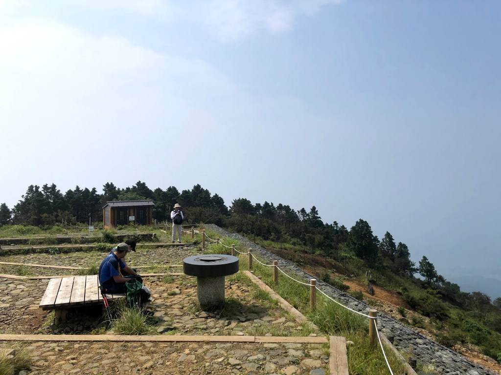Die eigentliche Spitze des Myojingatake ist weniger spektakulaer. Da es sich um einen sehr beliebten Berg handelt, ist dort immer sehr viel Betrieb und die paar Baenke die es gibt sind schnell besetzt. Bei klaren Tagen kann man wunderbar Fuji-san sehen, leider blieb uns dies an diesem Tag verwehrt wegen den anhaltenden dichten Wolken ueber Hakone-yama, ein sehr aktiver Vulkan mitten in Hakone. Vom Gipfel empfehle ich, entweder nach Gora 強羅abzusteigen, oder weiter auf den Myojogatake zu wandern.