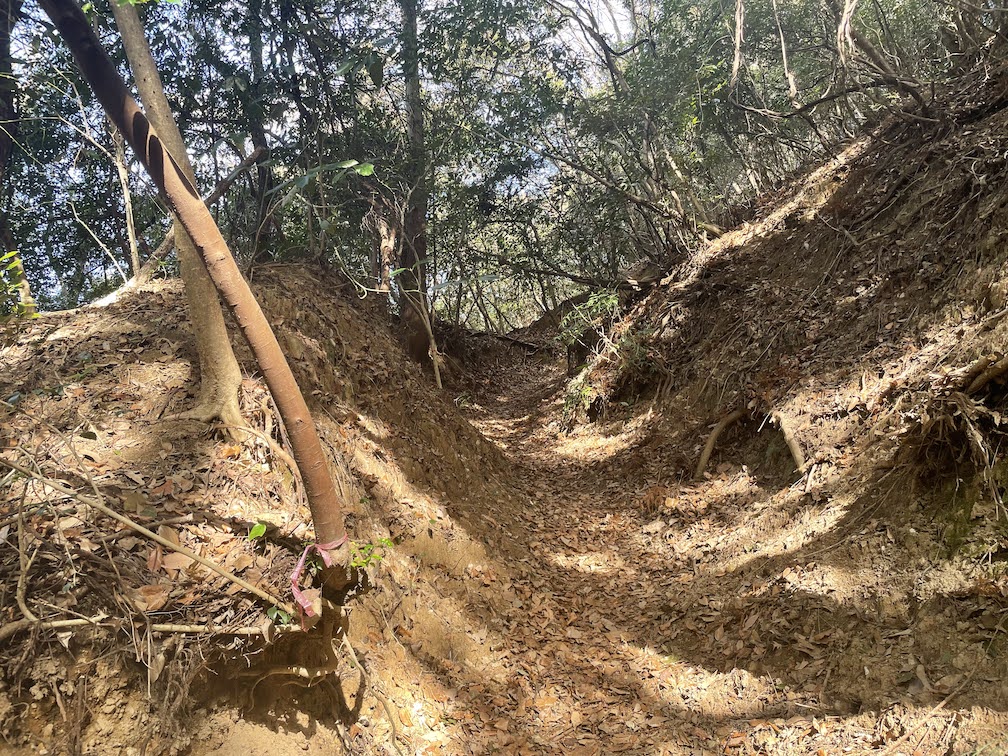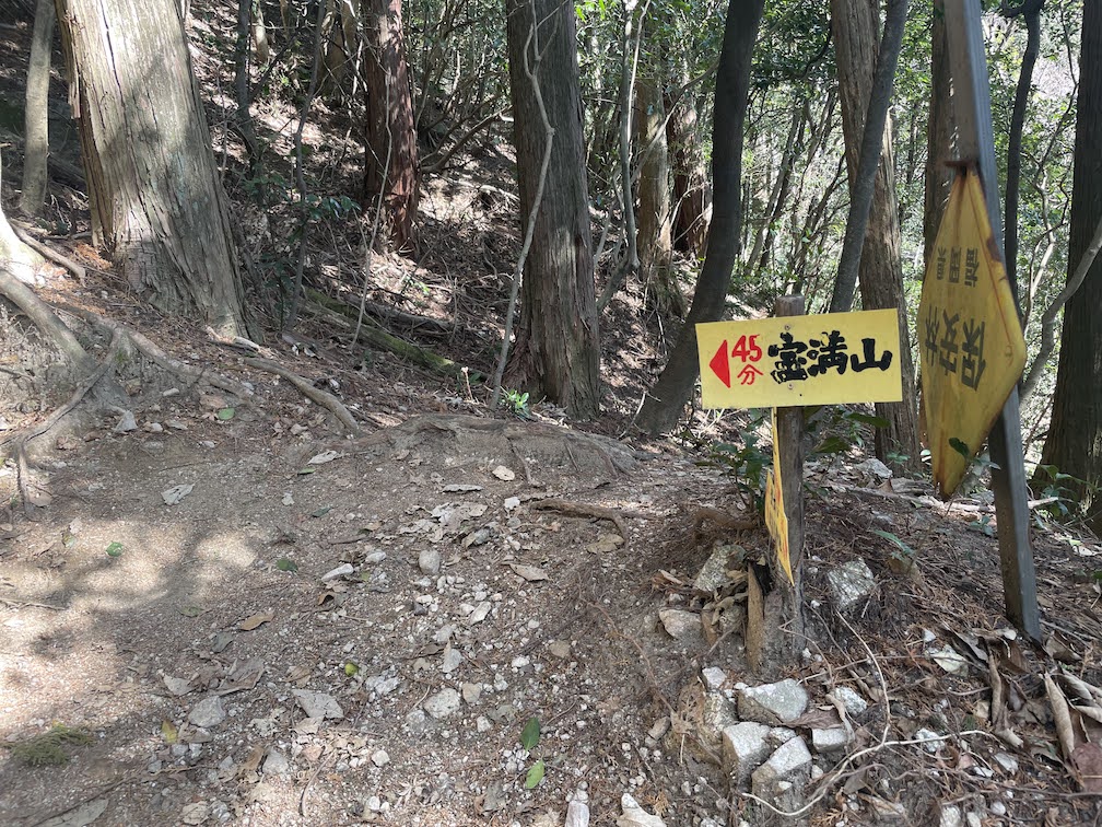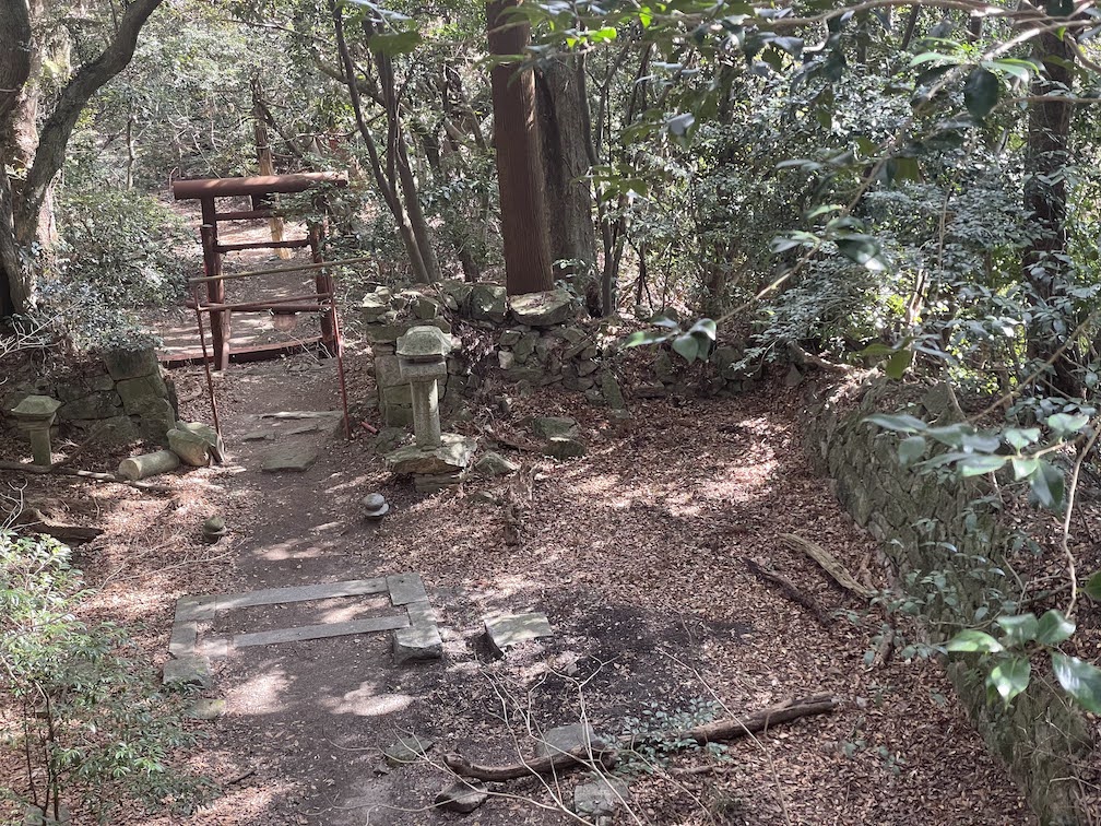 Auf der rechten Seite vom Kamado Schrein schliesslich beginnt der Wanderweg. Es gibt mehrere Wege nach oben, Ich entschloss mich, den Weg ueber den Odake-yama 大嶽山 zu nehmen, welcher auch ein kleinen Schrein beherbergt, den Odake-jinja 大嶽神社. Der Anfang ist wie immer ziemlich entspannt und fuehrt durch ein nettes dichtes Waldstueck. Nach einer halben Stunde gas es eine Kreuzung und eine Treppe links ab, die weiter zum Homan-zan fuehrt. Der Weg ist gut ausgeschildert, wenn auch groesstenteils nur auf Japanisch. Kurze Zeit spaeter ist mana uch schon auf dem Odake-yama. welcher mit 439m nicht allzu hoch ist. Dort befindet sich ein Schrein auf einer Erhoehung, die man durch steile Steinstuen erreichen kann. Davor befindet sich zwei alte verrostete rotes Torii 鳥居 sowie ein neueres. Nebenan findet sich auch das Fundament eines alten Hauses. Es scheint als waere dies frueher einmal ein Ort des Gebets gewesen aber wohl mittlerweile nicht mehr so gepflegt. Folgt man dem Weg weiter geradeaus kommt man nach kurzer Zeit an eine Kreuzung. Nimmt man den Weg diagonal nach links, geht es Richtung Homan-zan.