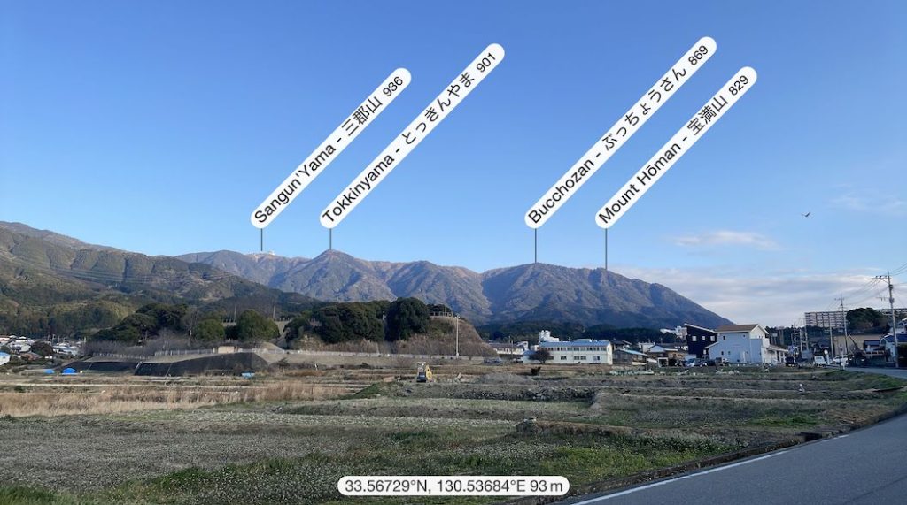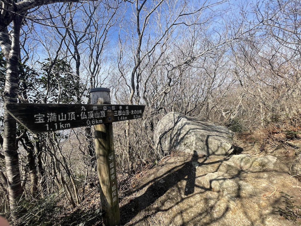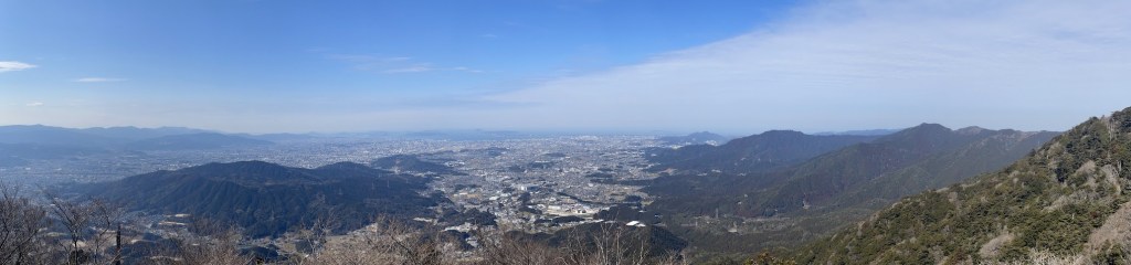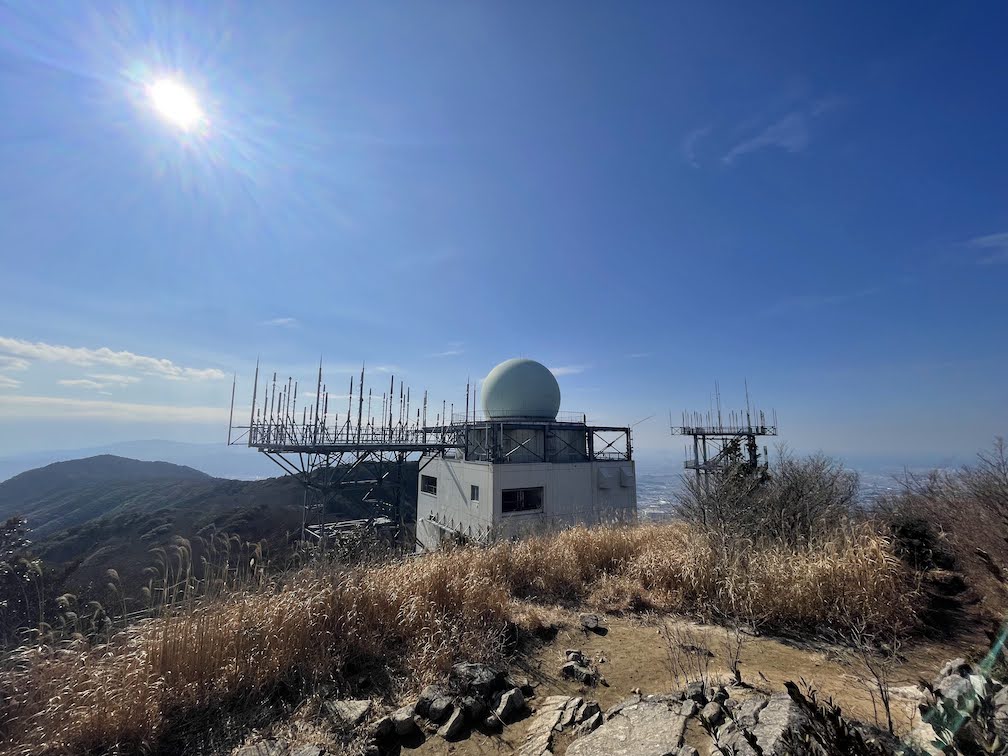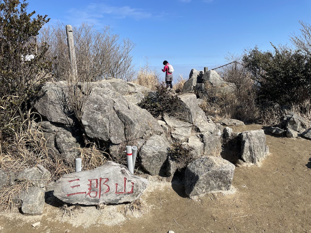 Der Weg ab der Kreuzung wird dann ein wenig steiler. Ab hier geht es relativ schnell nach oben und teilweise auch vorbei an grossen Felsen. Die Gegend um den Gipfel ist relativ felsig und so wundert es nicht, dass dort ab und an auch Eisenketten haengen, die das Klettern ein wenig erleichtern. Nach ca. 50 Minuten ist man dann schliesslich oben auf dem Gipfel angelangt und kann den Rundum-Blick geniessen. Neben dem Gipfelschrein gibt es auch einen grossen heiligen Fels, von dem man den besten Blick hat. An klaren Tagen kann man bis nach Fukuoka-Stadt sehen. Als ich oben angekommen bin, war super Wetter, schon relativ warm und das im Februar. Dieses tolle Wetter wollte ich ausnutzen und habe mich daher kurzfristisch entschlossen, weiter bis zum Sangun-san 三郡山 zu laufen. Der Sangun-san ist ein wenig hoeher als der Homan-zan und liegt noch eine ganze Strecke hinter dem Homan-zan. Auf dem Weg dorthin kommt man am Bucchou-san 仏頂山, und am am Tokin-yama 頭巾山 vorbei. Auf dem Weg bis zum Sangun-san wandert man dann auch die restlichen 100 Hoehenmeter, was aber ueber die lengere Entfernung des Berggrats relativ gemuetlich machbar ist. Am Sangun-san angekommen findet man dann eine Radarstation vor. Kurz dahinter liegt der Gipfel des Sangun-san. Von dort hat man nach 3 Seiten freien Blick und kann auch noch einmal auf den Homan-zan zurueckblicken. Von hier aus kann man dann wieder ins Tal absteigen. Der Abstieg ist dabei sehr steil und Vorsicht sei geboten. Weiter unten kommt auch ein Abschnitt mit Fluss, was ein wenig rutschig sein kann. Irgendwann kommt man dann auf eine Strasse und von dort ist es ein ziemlich langer Weg zu Fuss, vorbei an diversen Campingplaezen, mehreren Wohnsiedlungen, bis zur Station Umi 宇美駅. Spaeter habe ich gelsen, dass man beim Abstieg vom Tokin-yama an einem bekannten Wasserfall vorbeikommt, der auch noch zu der Zeit wo ich da war gefroren war. Haette ich das gewusst, waere ich das kurze Stueck zum Tokin-yama wieder zurueck gelaufen und von dort abgestiegen. Der Abstieg vom Sangun-san war relativ unspektakulaer.