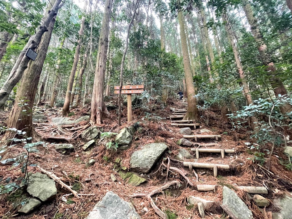 Der erste Gipfel nach ca 30 Minuten war der Taihei-san 大平山. Von da hatte man bereits eine gute Aussicht auf das Umland sowie die Karstlandschaft. Auf dem Weg nach oben traf ich einen Trailrunner sowie einen aelteren Herrn, beide luden mich zum Smalltalk ein. Das ist immer wieder faszinierend in Japan, und passiert sehr haeufig gerade wenn man allein unterwegs ist. Den Trailrunnee sollte ich dann amspaeter noch einmal wiedertreffen, er erzaehlte mir dass er aus der Gegend kommt und fuer einen bevorstehenden Trailrun trainiert, Der aeltere Herr offenbarte mir, dass er das erste Mal seit laengerem sich an den Anstieg wagte und je nach Moeglichkeit bis zum Nuki-san weiter wollte. Ihn habe ich spaeter nicht mehr gesehen (ich lief einen Umweg zum Nuki-san) und so vermutete ich, dass er die Kreuzung noch vor dem Nuki-san genommen hat und den leicht noerdlichen Weg zum Abstieg genommen hatte. Man kann vom Taihei-san, direkt rueber zum Nuki-san, ich entschied mich jedoch die Strecke ueber den Tou-ga-mine 塔ヶ峯 zu nehmen. Dies war das einzige Stueck auf dem Ganzen Weg, das durch einen Wald gefuehrt hat (die anderen Wege sind frei mit toller Sicht. Da es am Vortag in der Region geregnet hatte war es natuerlich im Wald noch ein wenig feucht am Boden. Man sollte immer bedenken, dass die Waelder langsamer trocknen. Dementsprechend bin ich auch ein paar mal ausgerutscht. Der Gipfel des Tou-ga-mine ist unspektakulaer und ohne Sicht (im Prinzip eine bewachsene Waldkreuzung). Man kann noch ca 10 Minuten weiter durch das Dickicht zu einem Aussichtspunkt auf einem Fels, aber der ist auch nur in eine Richtung frei. Ich wuerde daher fast schon empfehlen den Weg direkt zum Nuki-san zu nehmen, denn man verpasst da nichts.