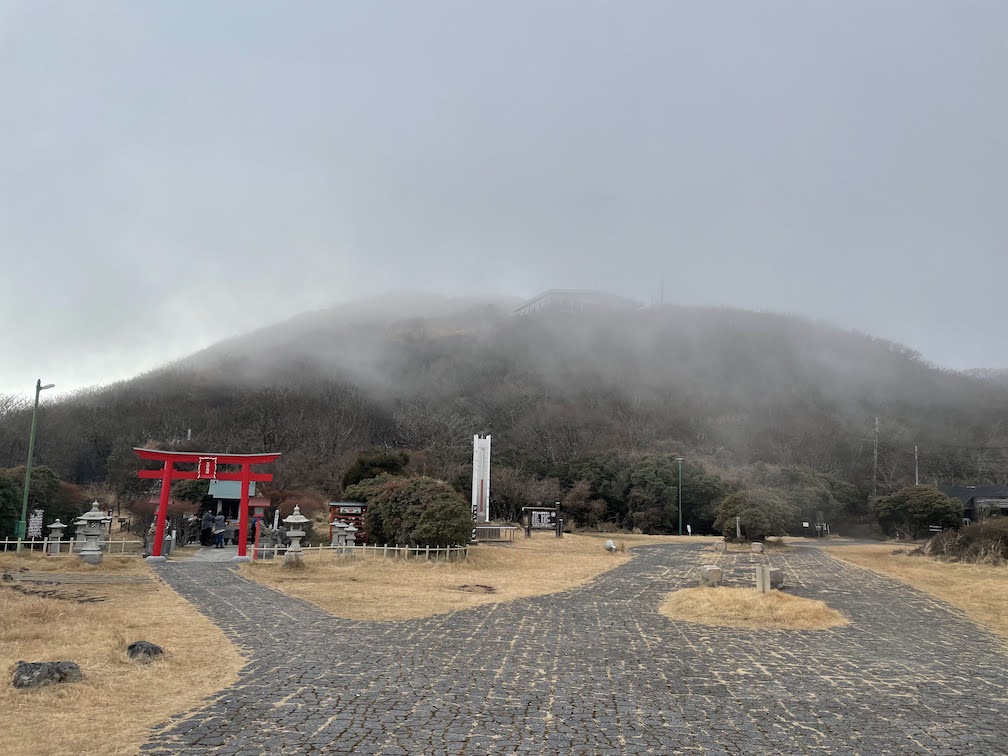 Nun gut, kurz auf die Karte geschaut, parkte ich beim Azalea Garten つつじ公園 am Fuße des Vulkans. Von diesem Parkplatz muss man die 300m zum Parkplatz am Krater auf Asphalt-Serpentinen hochlaufen. Da die Straße eh für den Verkehr gesperrt ist, hat man die komplette Straße für sich und muss sich halt nur mit dem Asphalt abfinden (was eher dann beim Hinunterlaufen nervt). Auf der Ebene des Parkplatzes angekommen, erblickt man auf der linken Seite bereits den sehr schön kegelförmigen 海向山 Kaiko-yama (dtsch. “Dem Meer zugewendeter Berg”?), welchen man auch mit der Wanderung auf den E-san verbinden kann, was ungefähr 2h länger dauert. Da ich am gleichen Tag wieder zurück nach Tokyo fliegen musste, entschied ich mich, nur den E-san zu besteigen.